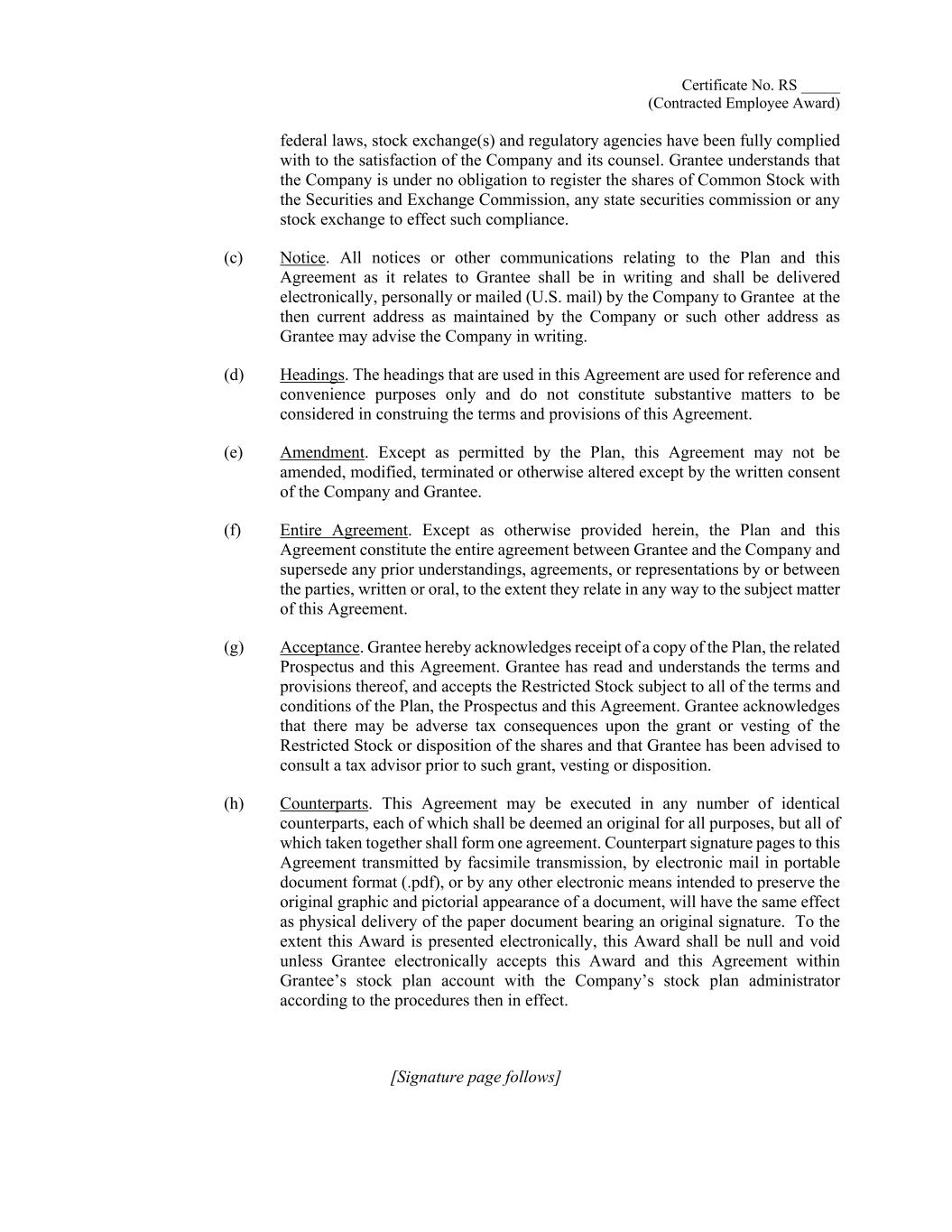 Certificate No. RS _____ (Contracted Employee Award) federal laws, stock exchange(s) and regulatory agencies have been fully complied with to the satisfaction of the Company and its counsel. Grantee understands that the Company is under no obligation to register the shares of Common Stock with the Securities and Exchange Commission, any state securities commission or any stock exchange to effect such compliance. (c) Notice. All notices or other communications relating to the Plan and this Agreement as it relates to Grantee shall be in writing and shall be delivered electronically, personally or mailed (U.S. mail) by the Company to Grantee at the then current address as maintained by the Company or such other address as Grantee may advise the Company in writing. (d) Headings. The headings that are used in this Agreement are used for reference and convenience purposes only and do not constitute substantive matters to be considered in construing the terms and provisions of this Agreement. (e) Amendment. Except as permitted by the Plan, this Agreement may not be amended, modified, terminated or otherwise altered except by the written consent of the Company and Grantee. (f) Entire Agreement. Except as otherwise provided herein, the Plan and this Agreement constitute the entire agreement between Grantee and the Company and supersede any prior understandings, agreements, or representations by or between the parties, written or oral, to the extent they relate in any way to the subject matter of this Agreement. (g) Acceptance. Grantee hereby acknowledges receipt of a copy of the Plan, the related Prospectus and this Agreement. Grantee has read and understands the terms and provisions thereof, and accepts the Restricted Stock subject to all of the terms and conditions of the Plan, the Prospectus and this Agreement. Grantee acknowledges that there may be adverse tax consequences upon the grant or vesting of the Restricted Stock or disposition of the shares and that Grantee has been advised to consult a tax advisor prior to such grant, vesting or disposition. (h) Counterparts. This Agreement may be executed in any number of identical counterparts, each of which shall be deemed an original for all purposes, but all of which taken together shall form one agreement. Counterpart signature pages to this Agreement transmitted by facsimile transmission, by electronic mail in portable document format (.pdf), or by any other electronic means intended to preserve the original graphic and pictorial appearance of a document, will have the same effect as physical delivery of the paper document bearing an original signature. To the extent this Award is presented electronically, this Award shall be null and void unless Grantee electronically accepts this Award and this Agreement within Grantee’s stock plan account with the Company’s stock plan administrator according to the procedures then in effect. [Signature page follows]