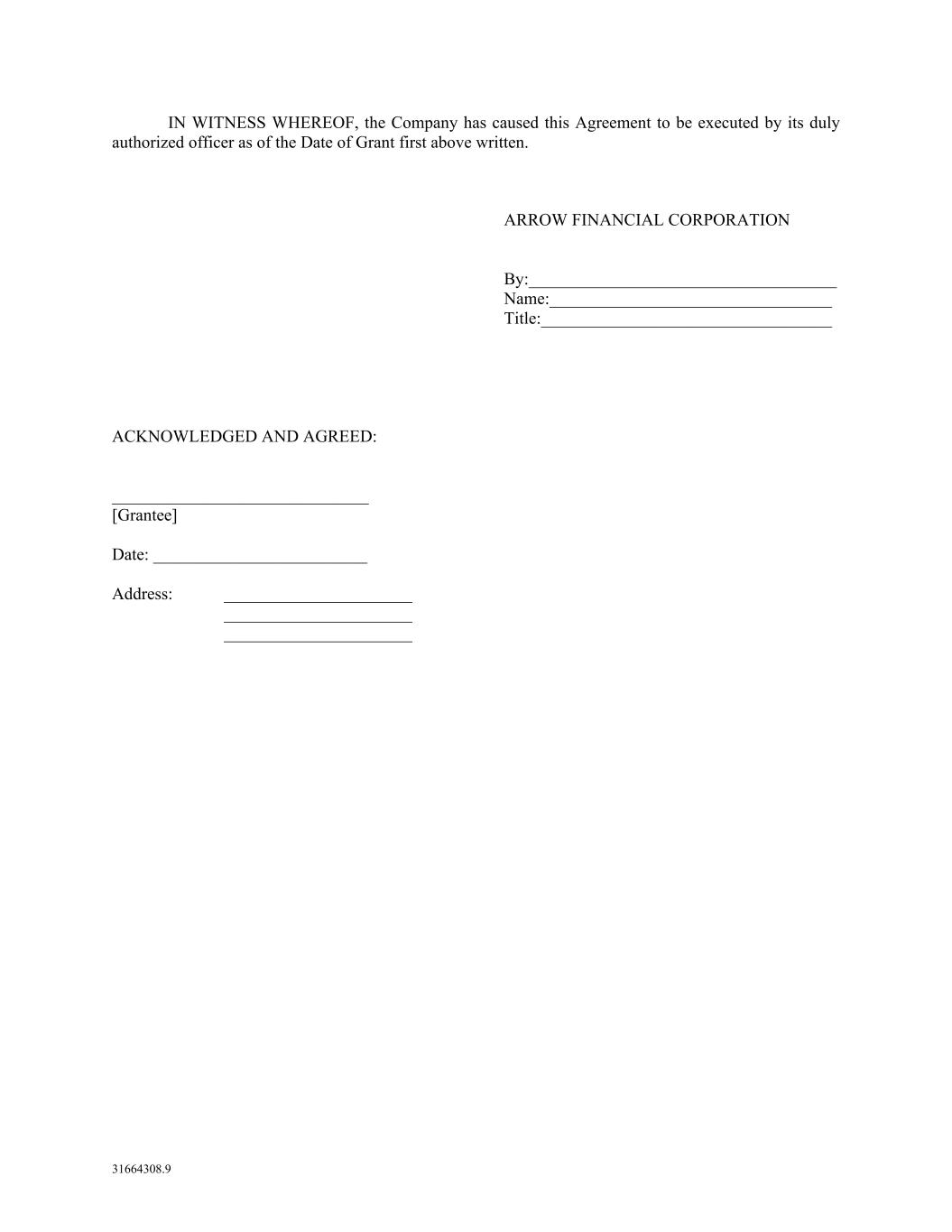 31664308.9 IN WITNESS WHEREOF, the Company has caused this Agreement to be executed by its duly authorized officer as of the Date of Grant first above written. ARROW FINANCIAL CORPORATION By:____________________________________ Name:_________________________________ Title:__________________________________ ACKNOWLEDGED AND AGREED: ______________________________ [Grantee] Date: _________________________ Address: ______________________ ______________________ ______________________
