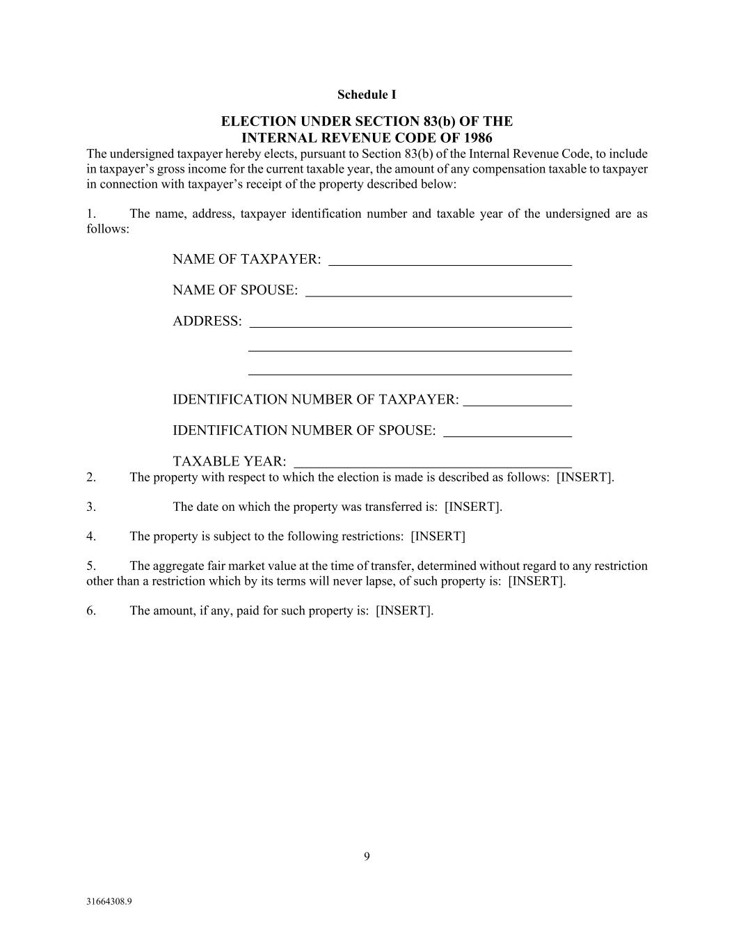 9 31664308.9 Schedule I ELECTION UNDER SECTION 83(b) OF THE INTERNAL REVENUE CODE OF 1986 The undersigned taxpayer hereby elects, pursuant to Section 83(b) of the Internal Revenue Code, to include in taxpayer’s gross income for the current taxable year, the amount of any compensation taxable to taxpayer in connection with taxpayer’s receipt of the property described below: 1. The name, address, taxpayer identification number and taxable year of the undersigned are as follows: NAME OF TAXPAYER: NAME OF SPOUSE: ADDRESS: IDENTIFICATION NUMBER OF TAXPAYER: IDENTIFICATION NUMBER OF SPOUSE: TAXABLE YEAR: 2. The property with respect to which the election is made is described as follows: [INSERT]. 3. The date on which the property was transferred is: [INSERT]. 4. The property is subject to the following restrictions: [INSERT] 5. The aggregate fair market value at the time of transfer, determined without regard to any restriction other than a restriction which by its terms will never lapse, of such property is: [INSERT]. 6. The amount, if any, paid for such property is: [INSERT].