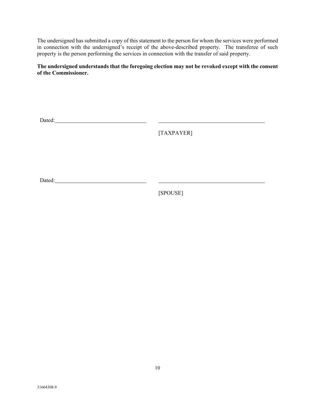 9 The undersigned has submitted a copy of this statement to the person for whom the services were performed in connection with the undersigned’s receipt of the above-described property. The transferee of such property is the person performing the services in connection with the transfer of said property. The undersigned understands that the foregoing election may not be revoked except with the consent of the Commissioner. Dated: [TAXPAYER] Dated: [SPOUSE]