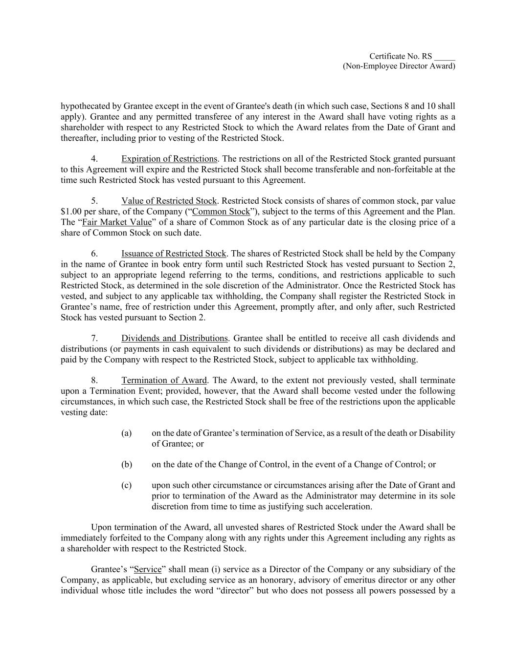 Certificate No. RS _____ (Non-Employee Director Award) hypothecated by Grantee except in the event of Grantee's death (in which such case, Sections 8 and 10 shall apply). Grantee and any permitted transferee of any interest in the Award shall have voting rights as a shareholder with respect to any Restricted Stock to which the Award relates from the Date of Grant and thereafter, including prior to vesting of the Restricted Stock. 4. Expiration of Restrictions. The restrictions on all of the Restricted Stock granted pursuant to this Agreement will expire and the Restricted Stock shall become transferable and non-forfeitable at the time such Restricted Stock has vested pursuant to this Agreement. 5. Value of Restricted Stock. Restricted Stock consists of shares of common stock, par value $1.00 per share, of the Company (“Common Stock”), subject to the terms of this Agreement and the Plan. The “Fair Market Value” of a share of Common Stock as of any particular date is the closing price of a share of Common Stock on such date. 6. Issuance of Restricted Stock. The shares of Restricted Stock shall be held by the Company in the name of Grantee in book entry form until such Restricted Stock has vested pursuant to Section 2, subject to an appropriate legend referring to the terms, conditions, and restrictions applicable to such Restricted Stock, as determined in the sole discretion of the Administrator. Once the Restricted Stock has vested, and subject to any applicable tax withholding, the Company shall register the Restricted Stock in Grantee’s name, free of restriction under this Agreement, promptly after, and only after, such Restricted Stock has vested pursuant to Section 2. 7. Dividends and Distributions. Grantee shall be entitled to receive all cash dividends and distributions (or payments in cash equivalent to such dividends or distributions) as may be declared and paid by the Company with respect to the Restricted Stock, subject to applicable tax withholding. 8. Termination of Award. The Award, to the extent not previously vested, shall terminate upon a Termination Event; provided, however, that the Award shall become vested under the following circumstances, in which such case, the Restricted Stock shall be free of the restrictions upon the applicable vesting date: (a) on the date of Grantee’s termination of Service, as a result of the death or Disability of Grantee; or (b) on the date of the Change of Control, in the event of a Change of Control; or (c) upon such other circumstance or circumstances arising after the Date of Grant and prior to termination of the Award as the Administrator may determine in its sole discretion from time to time as justifying such acceleration. Upon termination of the Award, all unvested shares of Restricted Stock under the Award shall be immediately forfeited to the Company along with any rights under this Agreement including any rights as a shareholder with respect to the Restricted Stock. Grantee’s “Service” shall mean (i) service as a Director of the Company or any subsidiary of the Company, as applicable, but excluding service as an honorary, advisory of emeritus director or any other individual whose title includes the word “director” but who does not possess all powers possessed by a