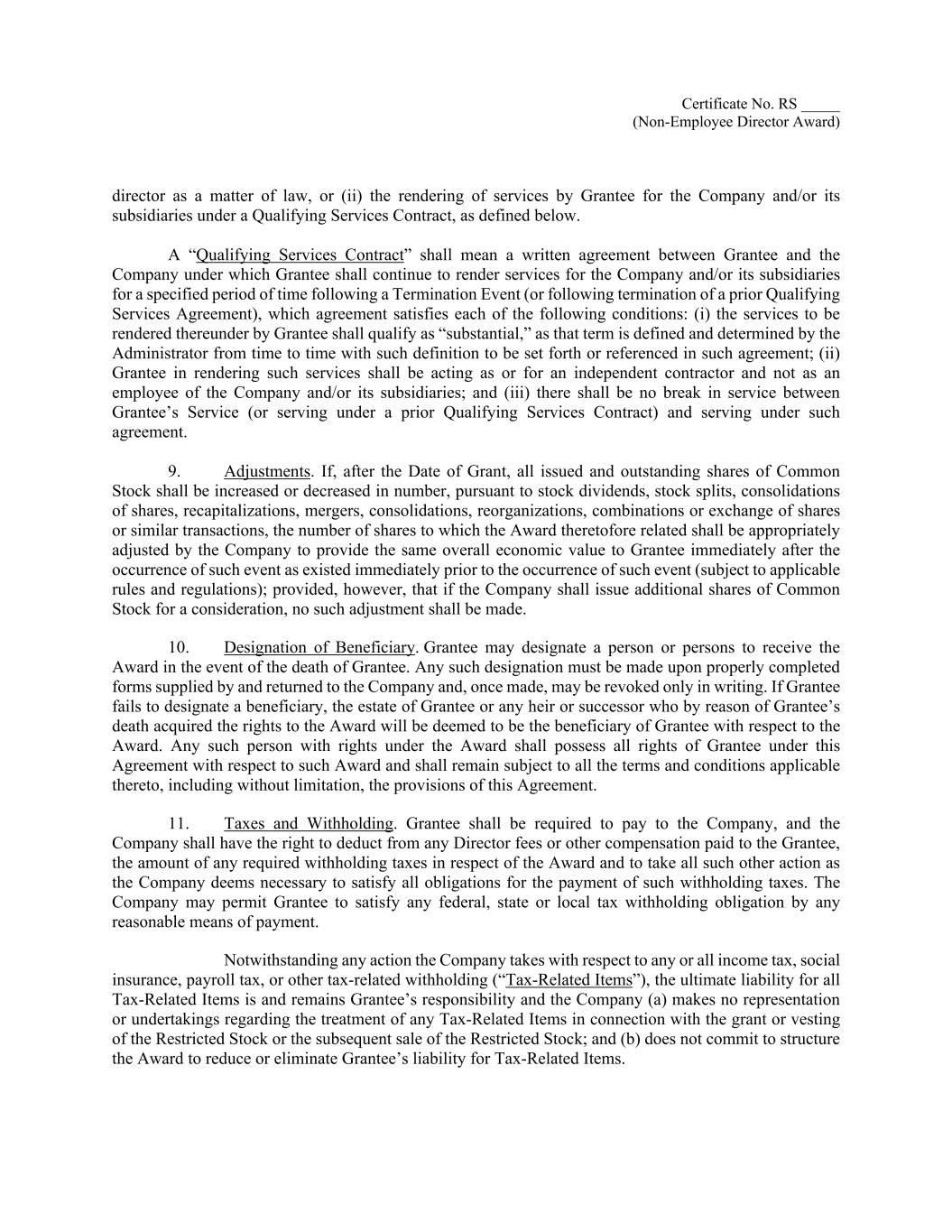 Certificate No. RS _____ (Non-Employee Director Award) director as a matter of law, or (ii) the rendering of services by Grantee for the Company and/or its subsidiaries under a Qualifying Services Contract, as defined below. A “Qualifying Services Contract” shall mean a written agreement between Grantee and the Company under which Grantee shall continue to render services for the Company and/or its subsidiaries for a specified period of time following a Termination Event (or following termination of a prior Qualifying Services Agreement), which agreement satisfies each of the following conditions: (i) the services to be rendered thereunder by Grantee shall qualify as “substantial,” as that term is defined and determined by the Administrator from time to time with such definition to be set forth or referenced in such agreement; (ii) Grantee in rendering such services shall be acting as or for an independent contractor and not as an employee of the Company and/or its subsidiaries; and (iii) there shall be no break in service between Grantee’s Service (or serving under a prior Qualifying Services Contract) and serving under such agreement. 9. Adjustments. If, after the Date of Grant, all issued and outstanding shares of Common Stock shall be increased or decreased in number, pursuant to stock dividends, stock splits, consolidations of shares, recapitalizations, mergers, consolidations, reorganizations, combinations or exchange of shares or similar transactions, the number of shares to which the Award theretofore related shall be appropriately adjusted by the Company to provide the same overall economic value to Grantee immediately after the occurrence of such event as existed immediately prior to the occurrence of such event (subject to applicable rules and regulations); provided, however, that if the Company shall issue additional shares of Common Stock for a consideration, no such adjustment shall be made. 10. Designation of Beneficiary. Grantee may designate a person or persons to receive the Award in the event of the death of Grantee. Any such designation must be made upon properly completed forms supplied by and returned to the Company and, once made, may be revoked only in writing. If Grantee fails to designate a beneficiary, the estate of Grantee or any heir or successor who by reason of Grantee’s death acquired the rights to the Award will be deemed to be the beneficiary of Grantee with respect to the Award. Any such person with rights under the Award shall possess all rights of Grantee under this Agreement with respect to such Award and shall remain subject to all the terms and conditions applicable thereto, including without limitation, the provisions of this Agreement. 11. Taxes and Withholding. Grantee shall be required to pay to the Company, and the Company shall have the right to deduct from any Director fees or other compensation paid to the Grantee, the amount of any required withholding taxes in respect of the Award and to take all such other action as the Company deems necessary to satisfy all obligations for the payment of such withholding taxes. The Company may permit Grantee to satisfy any federal, state or local tax withholding obligation by any reasonable means of payment. Notwithstanding any action the Company takes with respect to any or all income tax, social insurance, payroll tax, or other tax-related withholding (“Tax-Related Items”), the ultimate liability for all Tax-Related Items is and remains Grantee’s responsibility and the Company (a) makes no representation or undertakings regarding the treatment of any Tax-Related Items in connection with the grant or vesting of the Restricted Stock or the subsequent sale of the Restricted Stock; and (b) does not commit to structure the Award to reduce or eliminate Grantee’s liability for Tax-Related Items.