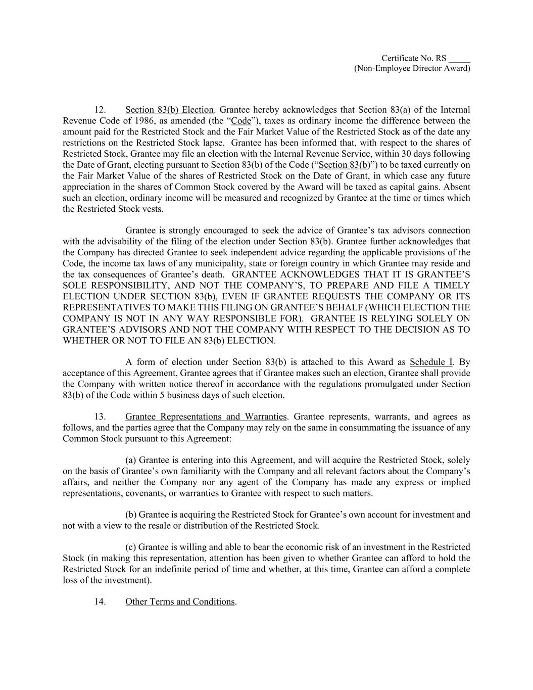 Certificate No. RS _____ (Non-Employee Director Award) 12. Section 83(b) Election. Grantee hereby acknowledges that Section 83(a) of the Internal Revenue Code of 1986, as amended (the “Code”), taxes as ordinary income the difference between the amount paid for the Restricted Stock and the Fair Market Value of the Restricted Stock as of the date any restrictions on the Restricted Stock lapse. Grantee has been informed that, with respect to the shares of Restricted Stock, Grantee may file an election with the Internal Revenue Service, within 30 days following the Date of Grant, electing pursuant to Section 83(b) of the Code (“Section 83(b)”) to be taxed currently on the Fair Market Value of the shares of Restricted Stock on the Date of Grant, in which case any future appreciation in the shares of Common Stock covered by the Award will be taxed as capital gains. Absent such an election, ordinary income will be measured and recognized by Grantee at the time or times which the Restricted Stock vests. Grantee is strongly encouraged to seek the advice of Grantee’s tax advisors connection with the advisability of the filing of the election under Section 83(b). Grantee further acknowledges that the Company has directed Grantee to seek independent advice regarding the applicable provisions of the Code, the income tax laws of any municipality, state or foreign country in which Grantee may reside and the tax consequences of Grantee’s death. GRANTEE ACKNOWLEDGES THAT IT IS GRANTEE’S SOLE RESPONSIBILITY, AND NOT THE COMPANY’S, TO PREPARE AND FILE A TIMELY ELECTION UNDER SECTION 83(b), EVEN IF GRANTEE REQUESTS THE COMPANY OR ITS REPRESENTATIVES TO MAKE THIS FILING ON GRANTEE’S BEHALF (WHICH ELECTION THE COMPANY IS NOT IN ANY WAY RESPONSIBLE FOR). GRANTEE IS RELYING SOLELY ON GRANTEE’S ADVISORS AND NOT THE COMPANY WITH RESPECT TO THE DECISION AS TO WHETHER OR NOT TO FILE AN 83(b) ELECTION. A form of election under Section 83(b) is attached to this Award as Schedule I. By acceptance of this Agreement, Grantee agrees that if Grantee makes such an election, Grantee shall provide the Company with written notice thereof in accordance with the regulations promulgated under Section 83(b) of the Code within 5 business days of such election. 13. Grantee Representations and Warranties. Grantee represents, warrants, and agrees as follows, and the parties agree that the Company may rely on the same in consummating the issuance of any Common Stock pursuant to this Agreement: (a) Grantee is entering into this Agreement, and will acquire the Restricted Stock, solely on the basis of Grantee’s own familiarity with the Company and all relevant factors about the Company’s affairs, and neither the Company nor any agent of the Company has made any express or implied representations, covenants, or warranties to Grantee with respect to such matters. (b) Grantee is acquiring the Restricted Stock for Grantee’s own account for investment and not with a view to the resale or distribution of the Restricted Stock. (c) Grantee is willing and able to bear the economic risk of an investment in the Restricted Stock (in making this representation, attention has been given to whether Grantee can afford to hold the Restricted Stock for an indefinite period of time and whether, at this time, Grantee can afford a complete loss of the investment). 14. Other Terms and Conditions.