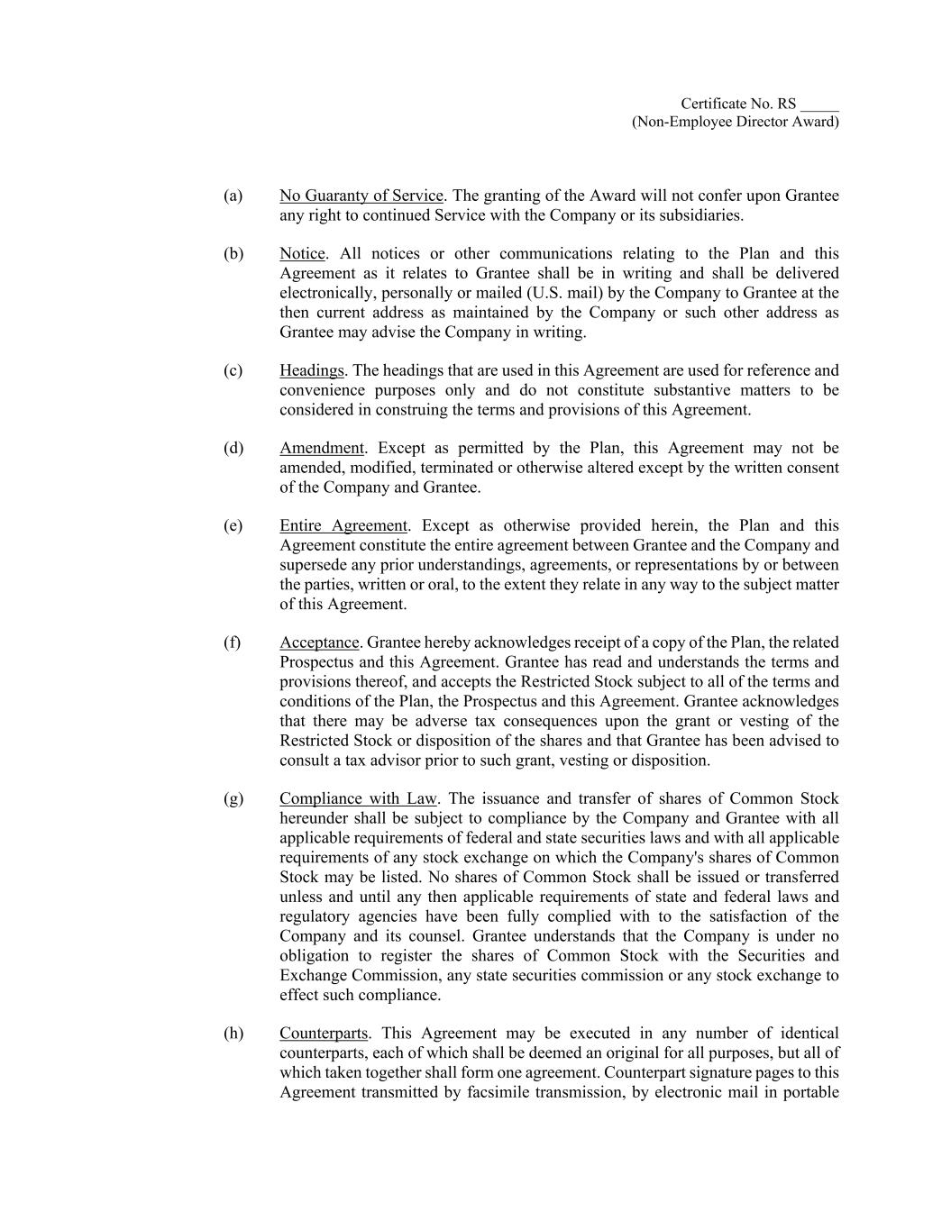 Certificate No. RS _____ (Non-Employee Director Award) (a) No Guaranty of Service. The granting of the Award will not confer upon Grantee any right to continued Service with the Company or its subsidiaries. (b) Notice. All notices or other communications relating to the Plan and this Agreement as it relates to Grantee shall be in writing and shall be delivered electronically, personally or mailed (U.S. mail) by the Company to Grantee at the then current address as maintained by the Company or such other address as Grantee may advise the Company in writing. (c) Headings. The headings that are used in this Agreement are used for reference and convenience purposes only and do not constitute substantive matters to be considered in construing the terms and provisions of this Agreement. (d) Amendment. Except as permitted by the Plan, this Agreement may not be amended, modified, terminated or otherwise altered except by the written consent of the Company and Grantee. (e) Entire Agreement. Except as otherwise provided herein, the Plan and this Agreement constitute the entire agreement between Grantee and the Company and supersede any prior understandings, agreements, or representations by or between the parties, written or oral, to the extent they relate in any way to the subject matter of this Agreement. (f) Acceptance. Grantee hereby acknowledges receipt of a copy of the Plan, the related Prospectus and this Agreement. Grantee has read and understands the terms and provisions thereof, and accepts the Restricted Stock subject to all of the terms and conditions of the Plan, the Prospectus and this Agreement. Grantee acknowledges that there may be adverse tax consequences upon the grant or vesting of the Restricted Stock or disposition of the shares and that Grantee has been advised to consult a tax advisor prior to such grant, vesting or disposition. (g) Compliance with Law. The issuance and transfer of shares of Common Stock hereunder shall be subject to compliance by the Company and Grantee with all applicable requirements of federal and state securities laws and with all applicable requirements of any stock exchange on which the Company's shares of Common Stock may be listed. No shares of Common Stock shall be issued or transferred unless and until any then applicable requirements of state and federal laws and regulatory agencies have been fully complied with to the satisfaction of the Company and its counsel. Grantee understands that the Company is under no obligation to register the shares of Common Stock with the Securities and Exchange Commission, any state securities commission or any stock exchange to effect such compliance. (h) Counterparts. This Agreement may be executed in any number of identical counterparts, each of which shall be deemed an original for all purposes, but all of which taken together shall form one agreement. Counterpart signature pages to this Agreement transmitted by facsimile transmission, by electronic mail in portable