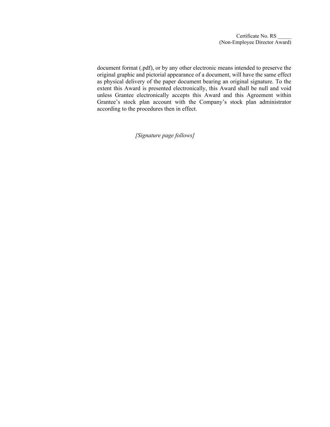 Certificate No. RS _____ (Non-Employee Director Award) document format (.pdf), or by any other electronic means intended to preserve the original graphic and pictorial appearance of a document, will have the same effect as physical delivery of the paper document bearing an original signature. To the extent this Award is presented electronically, this Award shall be null and void unless Grantee electronically accepts this Award and this Agreement within Grantee’s stock plan account with the Company’s stock plan administrator according to the procedures then in effect. [Signature page follows]