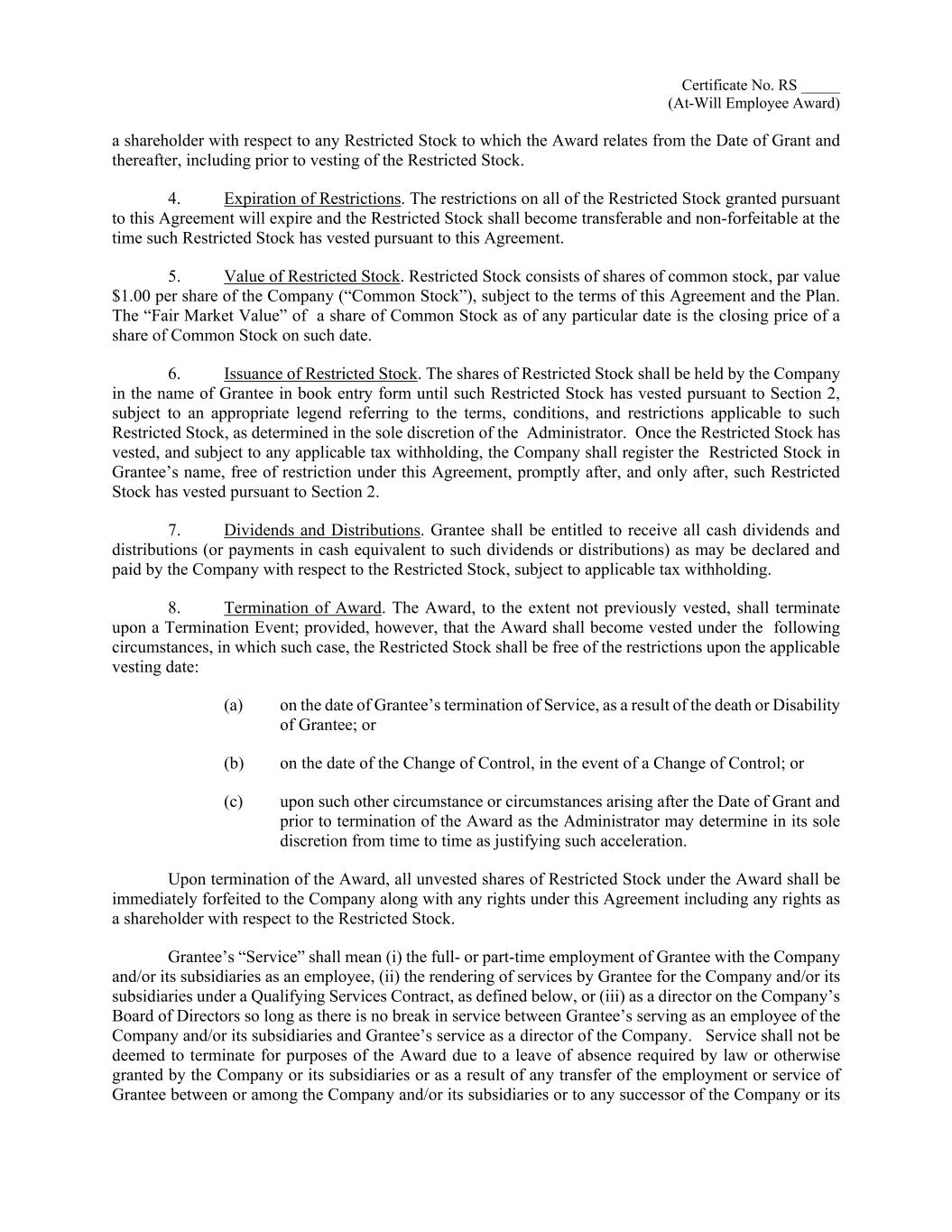 Certificate No. RS _____ (At-Will Employee Award) a shareholder with respect to any Restricted Stock to which the Award relates from the Date of Grant and thereafter, including prior to vesting of the Restricted Stock. 4. Expiration of Restrictions. The restrictions on all of the Restricted Stock granted pursuant to this Agreement will expire and the Restricted Stock shall become transferable and non-forfeitable at the time such Restricted Stock has vested pursuant to this Agreement. 5. Value of Restricted Stock. Restricted Stock consists of shares of common stock, par value $1.00 per share of the Company (“Common Stock”), subject to the terms of this Agreement and the Plan. The “Fair Market Value” of a share of Common Stock as of any particular date is the closing price of a share of Common Stock on such date. 6. Issuance of Restricted Stock. The shares of Restricted Stock shall be held by the Company in the name of Grantee in book entry form until such Restricted Stock has vested pursuant to Section 2, subject to an appropriate legend referring to the terms, conditions, and restrictions applicable to such Restricted Stock, as determined in the sole discretion of the Administrator. Once the Restricted Stock has vested, and subject to any applicable tax withholding, the Company shall register the Restricted Stock in Grantee’s name, free of restriction under this Agreement, promptly after, and only after, such Restricted Stock has vested pursuant to Section 2. 7. Dividends and Distributions. Grantee shall be entitled to receive all cash dividends and distributions (or payments in cash equivalent to such dividends or distributions) as may be declared and paid by the Company with respect to the Restricted Stock, subject to applicable tax withholding. 8. Termination of Award. The Award, to the extent not previously vested, shall terminate upon a Termination Event; provided, however, that the Award shall become vested under the following circumstances, in which such case, the Restricted Stock shall be free of the restrictions upon the applicable vesting date: (a) on the date of Grantee’s termination of Service, as a result of the death or Disability of Grantee; or (b) on the date of the Change of Control, in the event of a Change of Control; or (c) upon such other circumstance or circumstances arising after the Date of Grant and prior to termination of the Award as the Administrator may determine in its sole discretion from time to time as justifying such acceleration. Upon termination of the Award, all unvested shares of Restricted Stock under the Award shall be immediately forfeited to the Company along with any rights under this Agreement including any rights as a shareholder with respect to the Restricted Stock. Grantee’s “Service” shall mean (i) the full- or part-time employment of Grantee with the Company and/or its subsidiaries as an employee, (ii) the rendering of services by Grantee for the Company and/or its subsidiaries under a Qualifying Services Contract, as defined below, or (iii) as a director on the Company’s Board of Directors so long as there is no break in service between Grantee’s serving as an employee of the Company and/or its subsidiaries and Grantee’s service as a director of the Company. Service shall not be deemed to terminate for purposes of the Award due to a leave of absence required by law or otherwise granted by the Company or its subsidiaries or as a result of any transfer of the employment or service of Grantee between or among the Company and/or its subsidiaries or to any successor of the Company or its