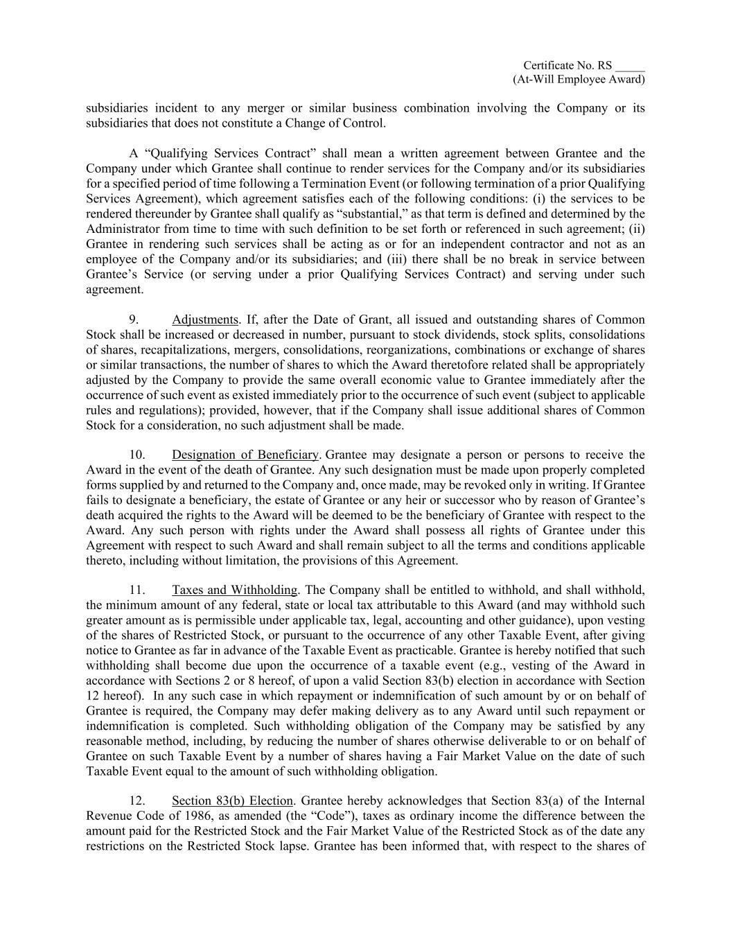Certificate No. RS _____ (At-Will Employee Award) subsidiaries incident to any merger or similar business combination involving the Company or its subsidiaries that does not constitute a Change of Control. A “Qualifying Services Contract” shall mean a written agreement between Grantee and the Company under which Grantee shall continue to render services for the Company and/or its subsidiaries for a specified period of time following a Termination Event (or following termination of a prior Qualifying Services Agreement), which agreement satisfies each of the following conditions: (i) the services to be rendered thereunder by Grantee shall qualify as “substantial,” as that term is defined and determined by the Administrator from time to time with such definition to be set forth or referenced in such agreement; (ii) Grantee in rendering such services shall be acting as or for an independent contractor and not as an employee of the Company and/or its subsidiaries; and (iii) there shall be no break in service between Grantee’s Service (or serving under a prior Qualifying Services Contract) and serving under such agreement. 9. Adjustments. If, after the Date of Grant, all issued and outstanding shares of Common Stock shall be increased or decreased in number, pursuant to stock dividends, stock splits, consolidations of shares, recapitalizations, mergers, consolidations, reorganizations, combinations or exchange of shares or similar transactions, the number of shares to which the Award theretofore related shall be appropriately adjusted by the Company to provide the same overall economic value to Grantee immediately after the occurrence of such event as existed immediately prior to the occurrence of such event (subject to applicable rules and regulations); provided, however, that if the Company shall issue additional shares of Common Stock for a consideration, no such adjustment shall be made. 10. Designation of Beneficiary. Grantee may designate a person or persons to receive the Award in the event of the death of Grantee. Any such designation must be made upon properly completed forms supplied by and returned to the Company and, once made, may be revoked only in writing. If Grantee fails to designate a beneficiary, the estate of Grantee or any heir or successor who by reason of Grantee’s death acquired the rights to the Award will be deemed to be the beneficiary of Grantee with respect to the Award. Any such person with rights under the Award shall possess all rights of Grantee under this Agreement with respect to such Award and shall remain subject to all the terms and conditions applicable thereto, including without limitation, the provisions of this Agreement. 11. Taxes and Withholding. The Company shall be entitled to withhold, and shall withhold, the minimum amount of any federal, state or local tax attributable to this Award (and may withhold such greater amount as is permissible under applicable tax, legal, accounting and other guidance), upon vesting of the shares of Restricted Stock, or pursuant to the occurrence of any other Taxable Event, after giving notice to Grantee as far in advance of the Taxable Event as practicable. Grantee is hereby notified that such withholding shall become due upon the occurrence of a taxable event (e.g., vesting of the Award in accordance with Sections 2 or 8 hereof, of upon a valid Section 83(b) election in accordance with Section 12 hereof). In any such case in which repayment or indemnification of such amount by or on behalf of Grantee is required, the Company may defer making delivery as to any Award until such repayment or indemnification is completed. Such withholding obligation of the Company may be satisfied by any reasonable method, including, by reducing the number of shares otherwise deliverable to or on behalf of Grantee on such Taxable Event by a number of shares having a Fair Market Value on the date of such Taxable Event equal to the amount of such withholding obligation. 12. Section 83(b) Election. Grantee hereby acknowledges that Section 83(a) of the Internal Revenue Code of 1986, as amended (the “Code”), taxes as ordinary income the difference between the amount paid for the Restricted Stock and the Fair Market Value of the Restricted Stock as of the date any restrictions on the Restricted Stock lapse. Grantee has been informed that, with respect to the shares of