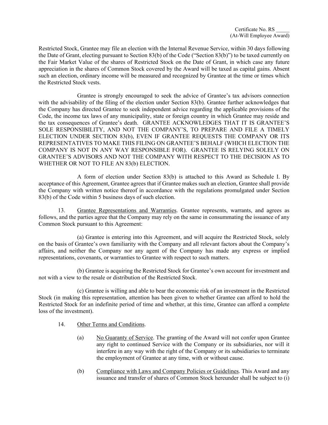 Certificate No. RS _____ (At-Will Employee Award) Restricted Stock, Grantee may file an election with the Internal Revenue Service, within 30 days following the Date of Grant, electing pursuant to Section 83(b) of the Code (“Section 83(b)”) to be taxed currently on the Fair Market Value of the shares of Restricted Stock on the Date of Grant, in which case any future appreciation in the shares of Common Stock covered by the Award will be taxed as capital gains. Absent such an election, ordinary income will be measured and recognized by Grantee at the time or times which the Restricted Stock vests. Grantee is strongly encouraged to seek the advice of Grantee’s tax advisors connection with the advisability of the filing of the election under Section 83(b). Grantee further acknowledges that the Company has directed Grantee to seek independent advice regarding the applicable provisions of the Code, the income tax laws of any municipality, state or foreign country in which Grantee may reside and the tax consequences of Grantee’s death. GRANTEE ACKNOWLEDGES THAT IT IS GRANTEE’S SOLE RESPONSIBILITY, AND NOT THE COMPANY’S, TO PREPARE AND FILE A TIMELY ELECTION UNDER SECTION 83(b), EVEN IF GRANTEE REQUESTS THE COMPANY OR ITS REPRESENTATIVES TO MAKE THIS FILING ON GRANTEE’S BEHALF (WHICH ELECTION THE COMPANY IS NOT IN ANY WAY RESPONSIBLE FOR). GRANTEE IS RELYING SOLELY ON GRANTEE’S ADVISORS AND NOT THE COMPANY WITH RESPECT TO THE DECISION AS TO WHETHER OR NOT TO FILE AN 83(b) ELECTION. A form of election under Section 83(b) is attached to this Award as Schedule I. By acceptance of this Agreement, Grantee agrees that if Grantee makes such an election, Grantee shall provide the Company with written notice thereof in accordance with the regulations promulgated under Section 83(b) of the Code within 5 business days of such election. 13. Grantee Representations and Warranties. Grantee represents, warrants, and agrees as follows, and the parties agree that the Company may rely on the same in consummating the issuance of any Common Stock pursuant to this Agreement: (a) Grantee is entering into this Agreement, and will acquire the Restricted Stock, solely on the basis of Grantee’s own familiarity with the Company and all relevant factors about the Company’s affairs, and neither the Company nor any agent of the Company has made any express or implied representations, covenants, or warranties to Grantee with respect to such matters. (b) Grantee is acquiring the Restricted Stock for Grantee’s own account for investment and not with a view to the resale or distribution of the Restricted Stock. (c) Grantee is willing and able to bear the economic risk of an investment in the Restricted Stock (in making this representation, attention has been given to whether Grantee can afford to hold the Restricted Stock for an indefinite period of time and whether, at this time, Grantee can afford a complete loss of the investment). 14. Other Terms and Conditions. (a) No Guaranty of Service. The granting of the Award will not confer upon Grantee any right to continued Service with the Company or its subsidiaries, nor will it interfere in any way with the right of the Company or its subsidiaries to terminate the employment of Grantee at any time, with or without cause. (b) Compliance with Laws and Company Policies or Guidelines. This Award and any issuance and transfer of shares of Common Stock hereunder shall be subject to (i)
