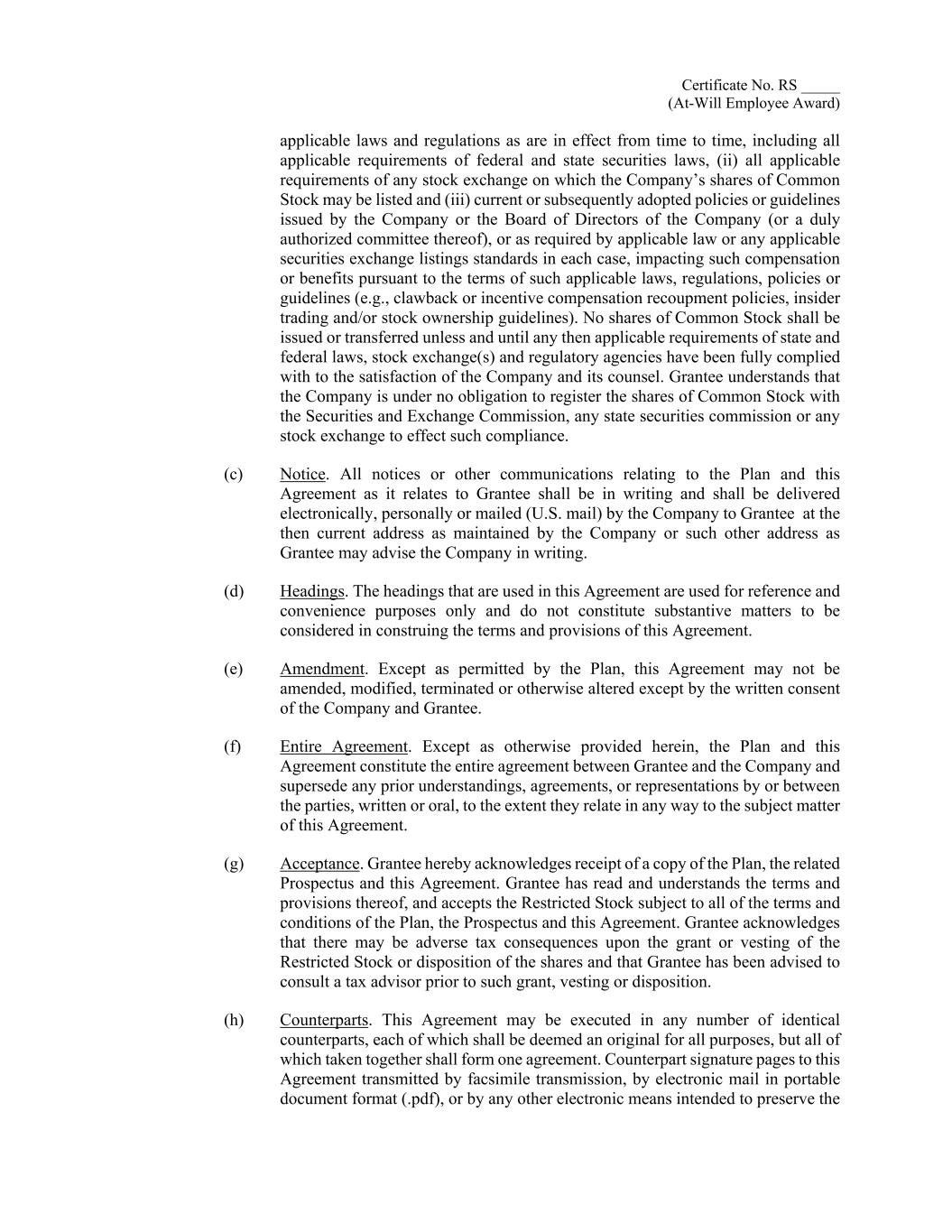 Certificate No. RS _____ (At-Will Employee Award) applicable laws and regulations as are in effect from time to time, including all applicable requirements of federal and state securities laws, (ii) all applicable requirements of any stock exchange on which the Company’s shares of Common Stock may be listed and (iii) current or subsequently adopted policies or guidelines issued by the Company or the Board of Directors of the Company (or a duly authorized committee thereof), or as required by applicable law or any applicable securities exchange listings standards in each case, impacting such compensation or benefits pursuant to the terms of such applicable laws, regulations, policies or guidelines (e.g., clawback or incentive compensation recoupment policies, insider trading and/or stock ownership guidelines). No shares of Common Stock shall be issued or transferred unless and until any then applicable requirements of state and federal laws, stock exchange(s) and regulatory agencies have been fully complied with to the satisfaction of the Company and its counsel. Grantee understands that the Company is under no obligation to register the shares of Common Stock with the Securities and Exchange Commission, any state securities commission or any stock exchange to effect such compliance. (c) Notice. All notices or other communications relating to the Plan and this Agreement as it relates to Grantee shall be in writing and shall be delivered electronically, personally or mailed (U.S. mail) by the Company to Grantee at the then current address as maintained by the Company or such other address as Grantee may advise the Company in writing. (d) Headings. The headings that are used in this Agreement are used for reference and convenience purposes only and do not constitute substantive matters to be considered in construing the terms and provisions of this Agreement. (e) Amendment. Except as permitted by the Plan, this Agreement may not be amended, modified, terminated or otherwise altered except by the written consent of the Company and Grantee. (f) Entire Agreement. Except as otherwise provided herein, the Plan and this Agreement constitute the entire agreement between Grantee and the Company and supersede any prior understandings, agreements, or representations by or between the parties, written or oral, to the extent they relate in any way to the subject matter of this Agreement. (g) Acceptance. Grantee hereby acknowledges receipt of a copy of the Plan, the related Prospectus and this Agreement. Grantee has read and understands the terms and provisions thereof, and accepts the Restricted Stock subject to all of the terms and conditions of the Plan, the Prospectus and this Agreement. Grantee acknowledges that there may be adverse tax consequences upon the grant or vesting of the Restricted Stock or disposition of the shares and that Grantee has been advised to consult a tax advisor prior to such grant, vesting or disposition. (h) Counterparts. This Agreement may be executed in any number of identical counterparts, each of which shall be deemed an original for all purposes, but all of which taken together shall form one agreement. Counterpart signature pages to this Agreement transmitted by facsimile transmission, by electronic mail in portable document format (.pdf), or by any other electronic means intended to preserve the