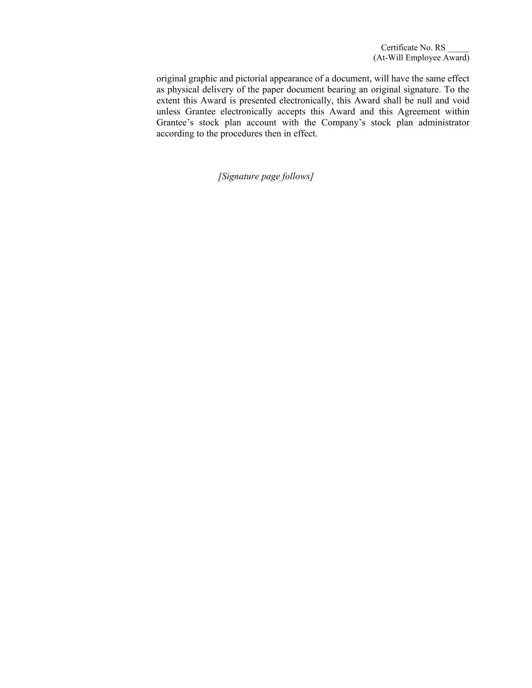 Certificate No. RS _____ (At-Will Employee Award) original graphic and pictorial appearance of a document, will have the same effect as physical delivery of the paper document bearing an original signature. To the extent this Award is presented electronically, this Award shall be null and void unless Grantee electronically accepts this Award and this Agreement within Grantee’s stock plan account with the Company’s stock plan administrator according to the procedures then in effect. [Signature page follows]