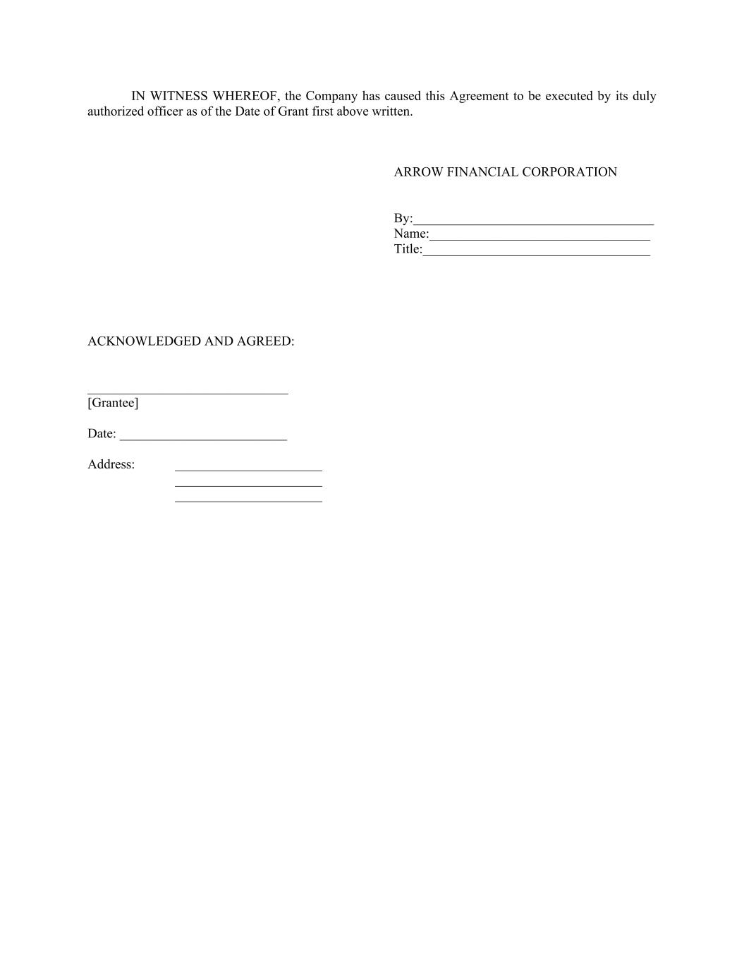 IN WITNESS WHEREOF, the Company has caused this Agreement to be executed by its duly authorized officer as of the Date of Grant first above written. ARROW FINANCIAL CORPORATION By:____________________________________ Name:_________________________________ Title:__________________________________ ACKNOWLEDGED AND AGREED: ______________________________ [Grantee] Date: _________________________ Address: ______________________ ______________________ ______________________