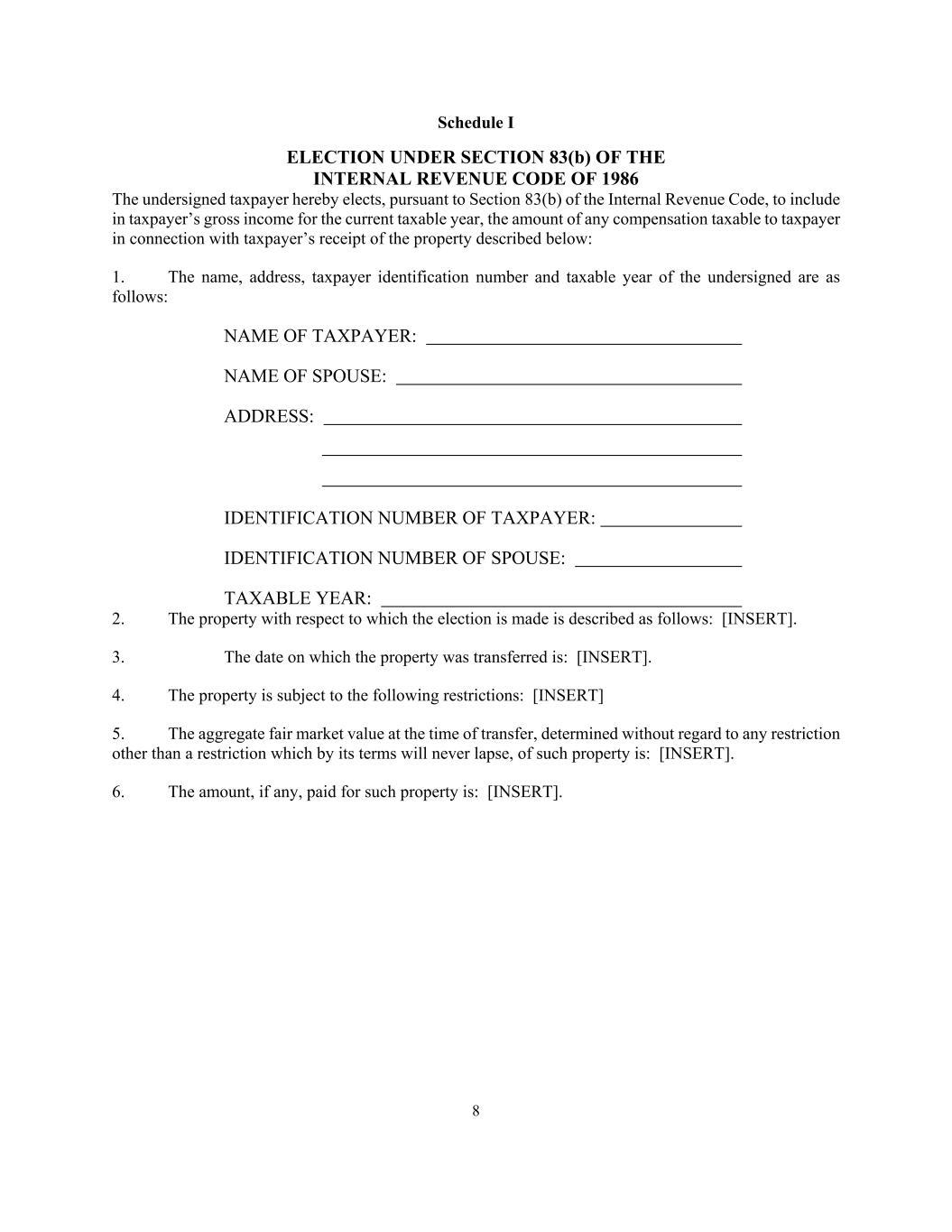 Schedule I ELECTION UNDER SECTION 83(b) OF THE INTERNAL REVENUE CODE OF 1986 The undersigned taxpayer hereby elects, pursuant to Section 83(b) of the Internal Revenue Code, to include in taxpayer’s gross income for the current taxable year, the amount of any compensation taxable to taxpayer in connection with taxpayer’s receipt of the property described below: 1. The name, address, taxpayer identification number and taxable year of the undersigned are as follows: NAME OF TAXPAYER: NAME OF SPOUSE: ADDRESS: IDENTIFICATION NUMBER OF TAXPAYER: IDENTIFICATION NUMBER OF SPOUSE: TAXABLE YEAR: 2. The property with respect to which the election is made is described as follows: [INSERT]. 3. The date on which the property was transferred is: [INSERT]. 4. The property is subject to the following restrictions: [INSERT] 5. The aggregate fair market value at the time of transfer, determined without regard to any restriction other than a restriction which by its terms will never lapse, of such property is: [INSERT]. 6. The amount, if any, paid for such property is: [INSERT].
