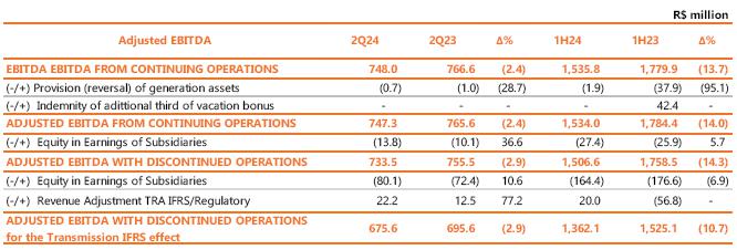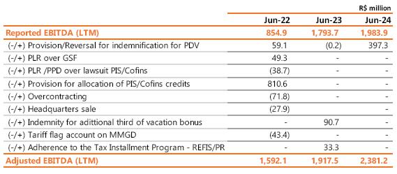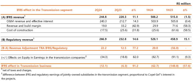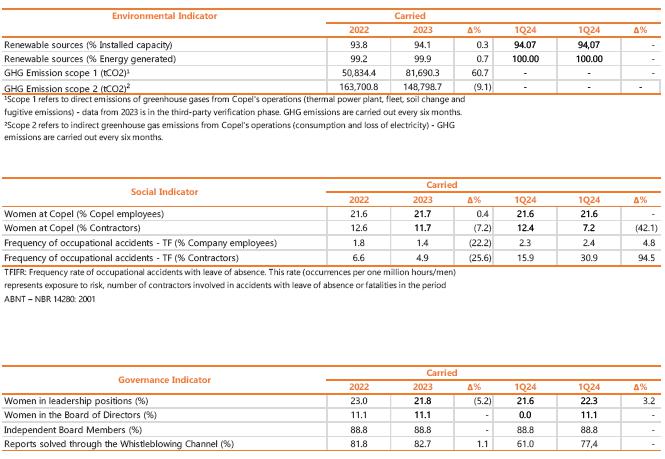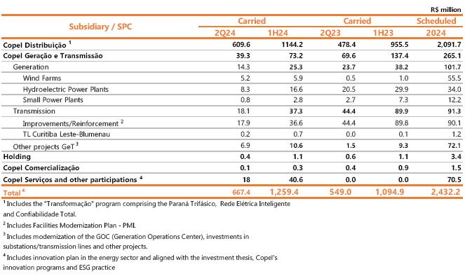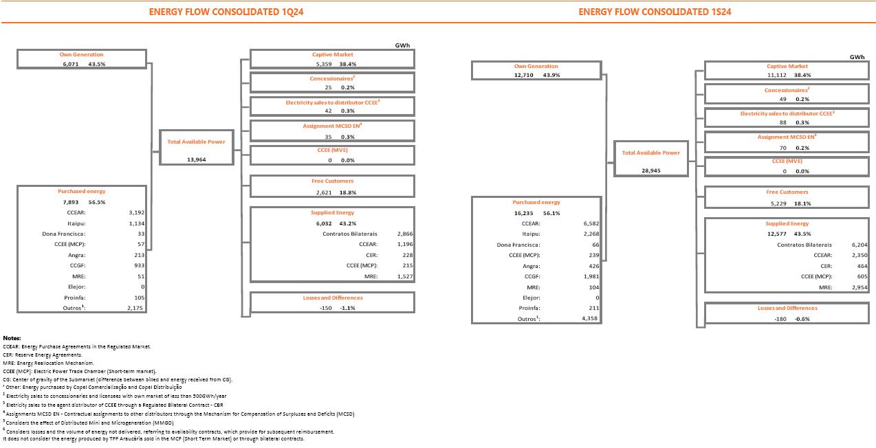 | 1 Proportional to Copel's interest in the project. Values referring to the 2023/2024 cycle, effective from July 1, 2024, according to REH 3.348/2024 - Technical Note No. 105/2024 – STR/ANEEL, of July 09, 2024. Considers investments that came into operation until 06/30/2024. ² Considers double circuit sections (circuits that share the same transmission tower). ³ Contract renewed according to Law 12,783/13. The O&M portion is part of the RBSE, under the terms of the Law. It will be received until the end of the concession (Jan/2043). The value of the APR for the 2024-2025 cycle, excluding the RBSE, according to REH 3,3348/2024, is R$ 148.3 million. This amount refers to additional RAP for reinforcements and improvements, in effect when REH 3,348/2024 was published. 4 As of 10.31.2018, the APR was reduced by 50%. 5 The construction of 38 km of sectioning lines was foreseen in the implementation of the Andirá Leste and Medianeira SEs, 2 km of which for Contract 060/2001 and 36 km for LTs that do not belong to Copel GeT, which, despite being included in the APR, in reason for the investment made, will not be added to Copel's assets. 6 As of 07/09/2021, the APR was reduced by 50%. 7 Consolidated Result. 8 Equity Income. | |||||||