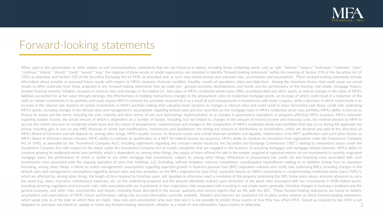 When used in this press release or other written or oral communications, statements that are not historical in nature, including those containing words such as “will,” “believe,” “expect,” “anticipate,” “estimate,” “plan,” “continue,” “intend,” “should,” “could,” “would,” “may,” the negative of these words or similar expressions, are intended to identify “forward-looking statements” within the meaning of Section 27A of the Securities Act of 1933, as amended, and Section 21E of the Securities Exchange Act of 1934, as amended, and, as such, may involve known and unknown risks, uncertainties and assumptions. These forward-looking statements include information about possible or assumed future results with respect to MFA’s business, financial condition, liquidity, results of operations, plans and objectives. Among the important factors that could cause our actual results to differ materially from those projected in any forward-looking statements that we make are: general economic developments and trends and the performance of the housing, real estate, mortgage finance, broader financial markets; inflation, increases in interest rates and changes in the market (i.e., fair) value of MFA’s residential whole loans, MBS, securitized debt and other assets, as well as changes in the value of MFA’s liabilities accounted for at fair value through earnings; the effectiveness of hedging transactions; changes in the prepayment rates on residential mortgage assets, an increase of which could result in a reduction of the yield on certain investments in its portfolio and could require MFA to reinvest the proceeds received by it as a result of such prepayments in investments with lower coupons, while a decrease in which could result in an increase in the interest rate duration of certain investments in MFA’s portfolio making their valuation more sensitive to changes in interest rates and could result in lower forecasted cash flows; credit risks underlying MFA’s assets, including changes in the default rates and management’s assumptions regarding default rates and loss severities on the mortgage loans in MFA’s residential whole loan portfolio; MFA’s ability to borrow to finance its assets and the terms, including the cost, maturity and other terms, of any such borrowings; implementation of or changes in government regulations or programs affecting MFA’s business; MFA’s estimates regarding taxable income, the actual amount of which is dependent on a number of factors, including, but not limited to, changes in the amount of interest income and financing costs, the method elected by MFA to accrete the market discount on residential whole loans and the extent of prepayments, realized losses and changes in the composition of MFA’s residential whole loan portfolios that may occur during the applicable tax period, including gain or loss on any MBS disposals or whole loan modifications, foreclosures and liquidations; the timing and amount of distributions to stockholders, which are declared and paid at the discretion of MFA’s Board of Directors and will depend on, among other things, MFA’s taxable income, its financial results and overall financial condition and liquidity, maintenance of its REIT qualification and such other factors as MFA’s Board of Directors deems relevant; MFA’s ability to maintain its qualification as a REIT for federal income tax purposes; MFA’s ability to maintain its exemption from registration under the Investment Company Act of 1940, as amended (or the “Investment Company Act”), including statements regarding the concept release issued by the Securities and Exchange Commission (“SEC”) relating to interpretive issues under the Investment Company Act with respect to the status under the Investment Company Act of certain companies that are engaged in the business of acquiring mortgages and mortgage-related interests; MFA’s ability to continue growing its residential whole loan portfolio, which is dependent on, among other things, the supply of loans offered for sale in the market; targeted or expected returns on our investments in recently-originated mortgage loans, the performance of which is, similar to our other mortgage loan investments, subject to, among other things, differences in prepayment risk, credit risk and financing costs associated with such investments; risks associated with the ongoing operation of Lima One Holdings, LLC (including, without limitation, industry competition, unanticipated expenditures relating to or liabilities arising from its operation (including, among other things, a failure to realize management’s assumptions regarding expected growth in business purpose loan (BPL) origination volumes and credit risks underlying BPLs, including changes in the default rates and management’s assumptions regarding default rates and loss severities on the BPLs originated by Lima One)); expected returns on MFA’s investments in nonperforming residential whole loans (“NPLs”), which are affected by, among other things, the length of time required to foreclose upon, sell, liquidate or otherwise reach a resolution of the property underlying the NPL, home price values, amounts advanced to carry the asset (e.g., taxes, insurance, maintenance expenses, etc. on the underlying property) and the amount ultimately realized upon resolution of the asset; risks associated with our investments in MSR-related assets, including servicing, regulatory and economic risks; risks associated with our investments in loan originators; risks associated with investing in real estate assets generally, including changes in business conditions and the general economy; and other risks, uncertainties and factors, including those described in the annual, quarterly and current reports that we file with the SEC. These forward-looking statements are based on beliefs, assumptions and expectations of MFA’s futur