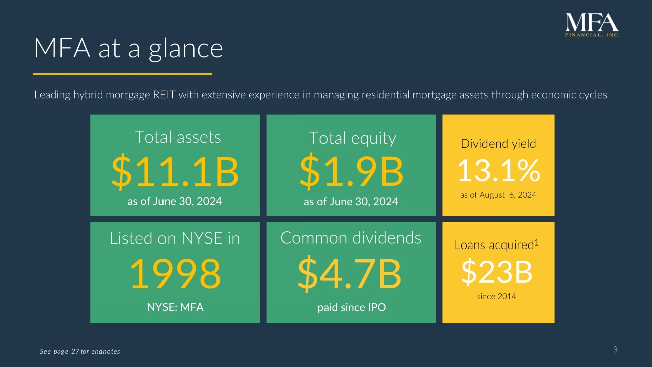 2 Q3 202 2 Financial Snapshot Forward - looking statements When used in this presentation or other written or oral communications, statements that are not historical in nature, including those containing words such as “will,” “believe,” “expect,” “anticipate,” “estimate,” “plan,” “continue,” “intend,” “should,” “could,” “would,” “may,” the negative of these words or similar expressions, are intended to identify “forward - looking statements” within the meaning of Section 27 A of the Securities Act of 1933 , as amended, and Section 21 E of the Securities Exchange Act of 1934 , as amended, and, as such, may involve known and unknown risks, uncertainties and assumptions . These forward - looking statements include information about possible or assumed future results with respect to MFA’s business, financial condition, liquidity, results of operations, plans and objectives . Among the important factors that could cause our actual results to differ materially from those projected in any forward - looking statements that we make are : general economic developments and trends and the performance of the housing, real estate, mortgage finance, broader financial markets ; inflation, increases in interest rates and changes in the market (i . e . , fair) value of MFA’s residential whole loans, MBS, securitized debt and other assets, as well as changes in the value of MFA’s liabilities accounted for at fair value through earnings ; the effectiveness of hedging transactions ; changes in the prepayment rates on residential mortgage assets, an increase of which could result in a reduction of the yield on certain investments in its portfolio and could require MFA to reinvest the proceeds received by it as a result of such prepayments in investments with lower coupons, while a decrease in which could result in an increase in the interest rate duration of certain investments in MFA’s portfolio making their valuation more sensitive to changes in interest rates and could result in lower forecasted cash flows ; credit risks underlying MFA’s assets, including changes in the default rates and management’s assumptions regarding default rates and loss severities on the mortgage loans in MFA’s residential whole loan portfolio ; MFA’s ability to borrow to finance its assets and the terms, including the cost, maturity and other terms, of any such borrowings ; implementation of or changes in government regulations or programs affecting MFA’s business ; MFA’s estimates regarding taxable income, the actual amount of which is dependent on a number of factors, including, but not limited to, changes in the amount of interest income and financing costs, the method elected by MFA to accrete the market discount on residential whole loans and the extent of prepayments, realized losses and changes in the composition of MFA’s residential whole loan portfolios that may occur during the applicable tax period, including gain or loss on any MBS disposals or whole loan modifications, foreclosures and liquidations ; the timing and amount of distributions to stockholders, which are declared and paid at the discretion of MFA’s Board of Directors and will depend on, among other things, MFA’s taxable income, its financial results and overall financial condition and liquidity, maintenance of its REIT qualification and such other factors as MFA’s Board of Directors deems relevant ; MFA’s ability to maintain its qualification as a REIT for federal income tax purposes ; MFA’s ability to maintain its exemption from registration under the Investment Company Act of 1940 , as amended (or the “Investment Company Act”), including statements regarding the concept release issued by the Securities and Exchange Commission (“SEC”) relating to interpretive issues under the Investment Company Act with respect to the status under the Investment Company Act of certain companies that are engaged in the business of acquiring mortgages and mortgage - related interests ; MFA’s ability to continue growing its residential whole loan portfolio, which is dependent on, among other things, the supply of loans offered for sale in the market ; targeted or expected returns on our investments in recently - originated mortgage loans, the performance of which is, similar to our other mortgage loan investments, subject to, among other things, differences in prepayment risk, credit risk and financing costs associated with such investments ; risks associated with the ongoing operation of Lima One Holdings, LLC (including, without limitation, industry competition, unanticipated expenditures relating to or liabilities arising from its operation (including, among other things, a failure to realize management’s assumptions regarding expected growth in business purpose loan (BPL) origination volumes and credit risks underlying BPLs, including changes in the default rates and management’s assumptions regarding default rates and loss severities on the BPLs originated by Lima One) ; expected returns on MFA’s investments in nonperforming residential whole loans (“NPLs”), which are affected by, among other things, the length of time required to foreclose upon, sell, liquidate or otherwise reach a resolution of the property underlying the NPL, home price values, amounts advanced to carry the asset (e . g . , taxes, insurance, maintenance expenses, etc . on the underlying property) and the amount ultimately realized upon resolution of the asset ; risks associated with our investments in MSR - related assets, including servicing, regulatory and economic risks ; risks associated with our investments in loan originators ; risks associated with investing in real estate assets generally, including changes in business conditions and the general economy ; and other risks, uncertainties and factors, including those described in the annual, quarterly and current reports that we file with the S