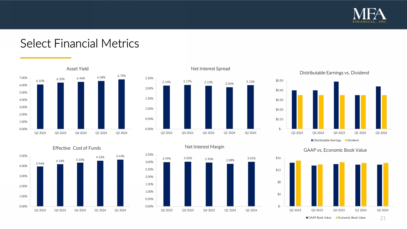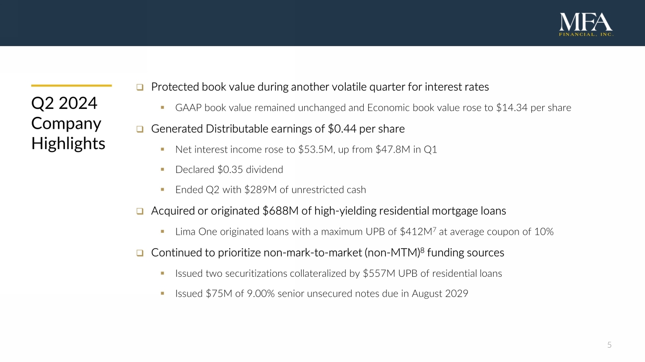 | · | Distributable earnings, a non-GAAP financial measure, were $45.6 million, or $0.44 per basic common share. MFA paid a regular cash dividend of $0.35 per common share on July 31, 2024. |