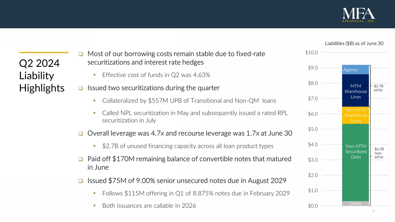 | · | MFA’s Debt/Net Equity Ratio was 4.7x and recourse leverage was 1.7x at June 30, 2024. |