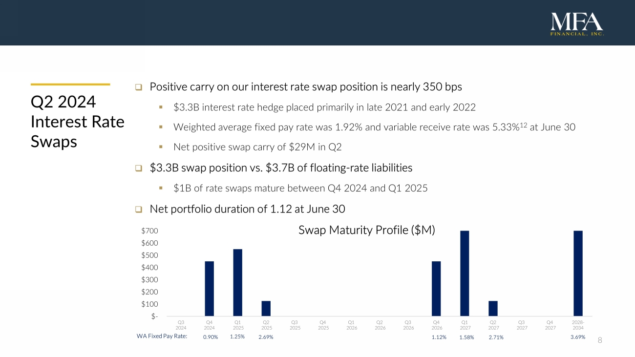 | · | MFA increased its position in interest rate swaps to a notional amount of approximately $3.3 billion. At June 30, 2024, these swaps had a weighted average fixed pay interest rate of 1.92% and a weighted average variable receive interest rate of 5.33%. |