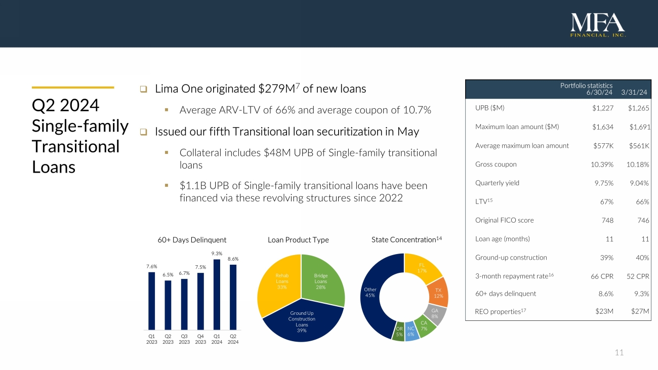 10 □ $412M of origination volume in Q2 7 ▪ Average LTV 15 of 66% and FICO score of 753 ▪ Origination fees, servicing fees and other fee income totaled $7.6M □ Lima One has originated $6.4B 7 of BPLs for MFA’s balance sheet in the three years since our acquisition in Q3 2021 ▪ Lima offers a broad range of loan products to real estate investors nationwide including rehab loans, bridge loans, construction loans, rental loans and small - balance multifamily loans □ 60+ day delinquency rate rose modestly to 4.8% for BPLs originated by Lima One Q2 2024 Lima One Highlights 6.38% 5.38% 6.13% 5.70% 6.09% 6.58% 6.62% 6.88% 7.21% 7.45% 7.66% 7.99% Q3 2021 Q4 2021 Q1 2022 Q2 2022 Q3 2022 Q4 2022 Q1 2023 Q2 2023 Q3 2023 Q4 2023 Q1 2024 Q2 2024 BPL Portfolio Yield - $1B $2B $3B $4B $5B $6B $7B Q3 2021 Q4 2021 Q1 2022 Q2 2022 Q3 2022 Q4 2022 Q1 2023 Q2 2023 Q3 2023 Q4 2023 Q1 2024 Q2 2024 Origination Volume Since Acquisition 7