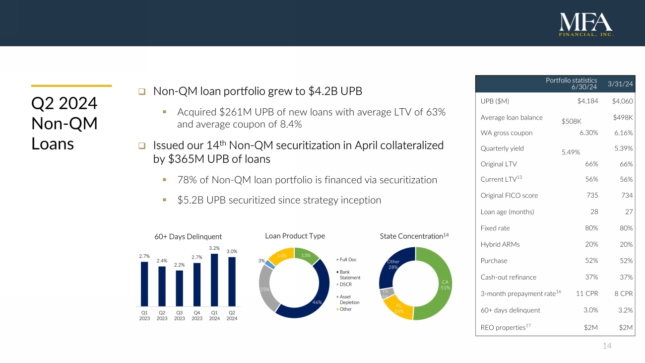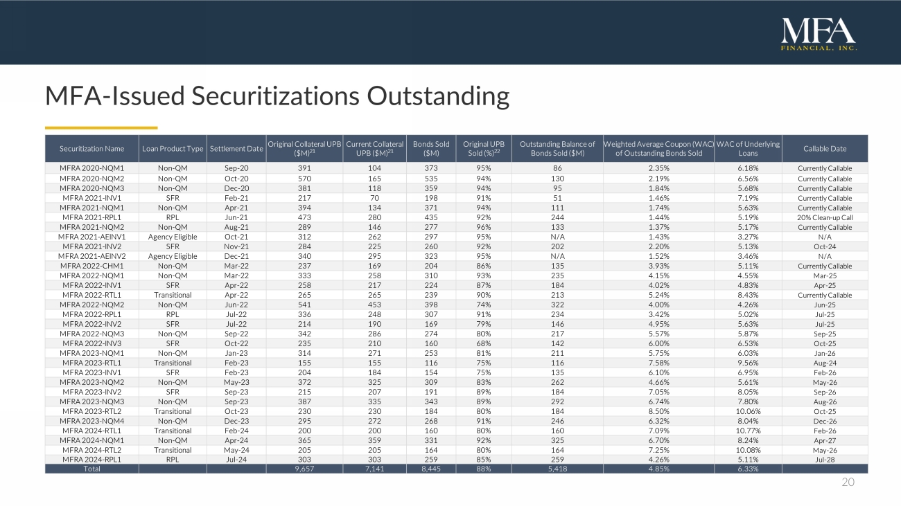 | · | MFA completed two loan securitizations during the quarter, collateralized by $365.2 million UPB of Non-QM loans and $191.8 million UPB of Transitional loans, bringing its total securitized debt to approximately $5.0 billion. |