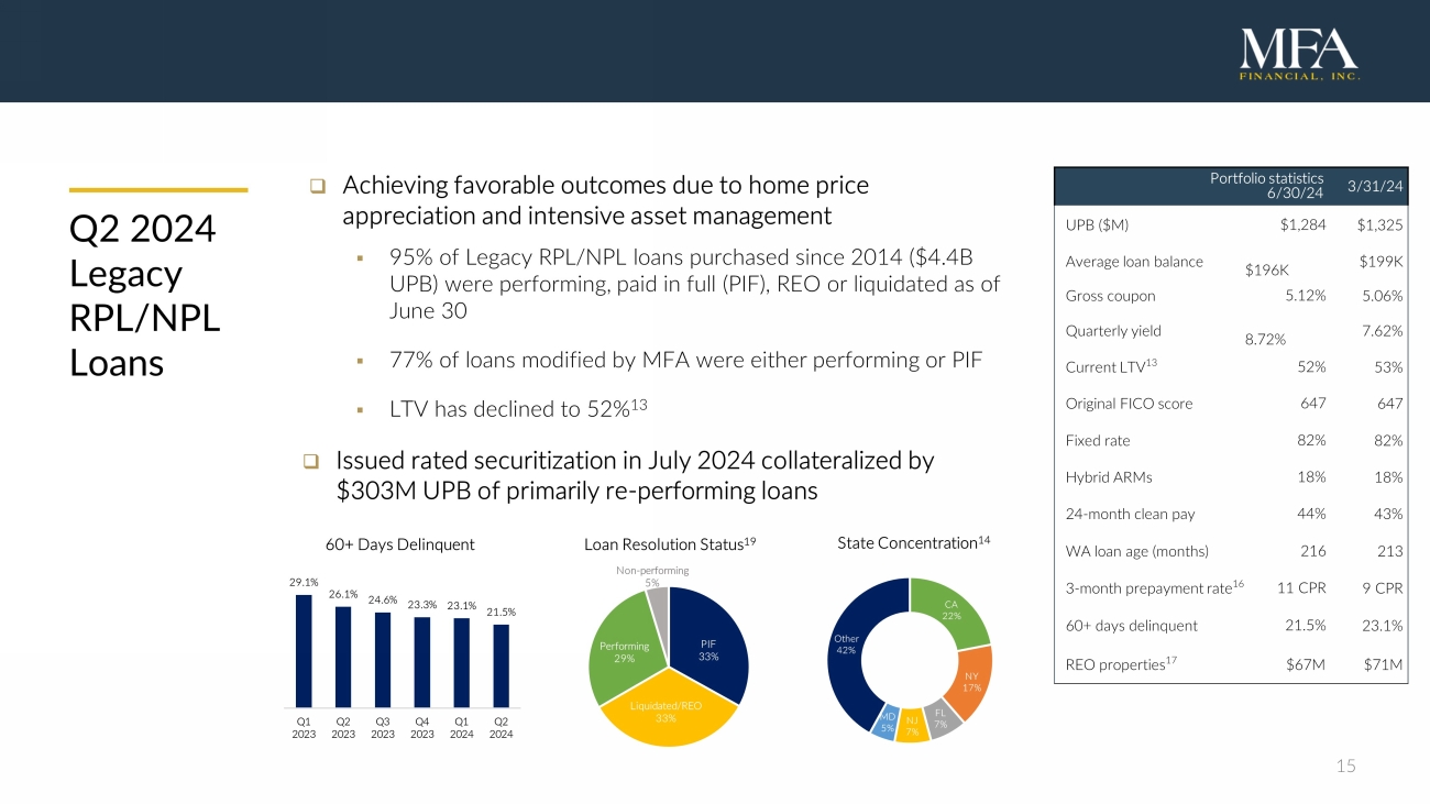 14 Q2 2024 Non - QM Loans □ Non - QM loan portfolio grew to $4.2B UPB ▪ Acquired $261M UPB of new loans with average LTV of 63% and average coupon of 8.4% □ Issued our 14 th Non - QM securitization in April collateralized by $365M UPB of loans ▪ 78% of Non - QM loan portfolio is financed via securitization ▪ $5.2B UPB securitized since strategy inception P ortfolio s tatistics 6/30/24 3/31/24 UPB ($M) $4,184 $4,060 1 Average loan balance $508K $498K 1 WA gross coupon 6.30% 6.16% 1 Quarterly yield 5.49% 5.39% 1 Original LTV 66% 66% 1 Current LTV 13 56% 56% 1 Original FICO score 735 734 1 Loan age (months) 28 27 1 Fixed rate 80% 80% 1 Hybrid ARMs 20% 20% 1 Purchase 52% 52% 1 Cash - out refinance 37% 37% 1 3 - month prepayment rate 16 11 CPR 8 CPR 1 60+ days delinquent 3.0% 3.2% 1 REO properties 17 $2M $2M 1 CA 51% FL 16% TX 5% Other 28% State Concentration 14 13% 46% 25% 3% 14% Loan Product Type Full Doc Bank Statement DSCR Asset Depletion Other 2.7% 2.4% 2.2% 2.7% 3.2% 3.0% Q1 2023 Q2 2023 Q3 2023 Q4 2023 Q1 2024 Q2 2024 60+ Days Delinquent