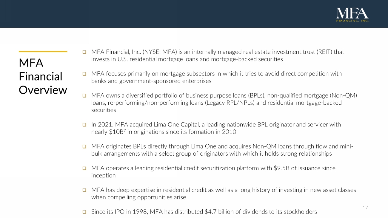 MFA Financial, Inc. (NYSE: MFA) is a leading specialty finance company that invests in residential mortgage loans, residential mortgage-backed securities and other real estate assets. Through its wholly-owned subsidiary, Lima One Capital, MFA also originates and services business purpose loans for real estate investors. MFA has distributed $4.7 billion in dividends to stockholders since its initial public offering in 1998. MFA is an internally-managed, publicly-traded real estate investment trust.
