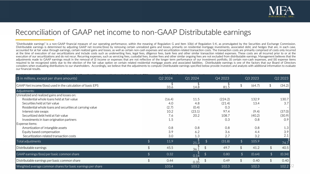 22 Reconciliation of GAAP net income to non - GAAP Distributable earnings “Distributable earnings” is a non - GAAP financial measure of our operating performance, within the meaning of Regulation G and Item 10 (e) of Regulation S - K, as promulgated by the Securities and Exchange Commission . Distributable earnings is determined by adjusting GAAP net income/(loss) by removing certain unrealized gains and losses, primarily on residential mortgage investments, associated debt, and hedges that are, in each case, accounted for at fair value through earnings, certain realized gains and losses, as well as certain non - cash expenses and securitization - related transaction costs . The transaction costs are primarily comprised of costs only incurred at the time of execution of our securitizations and include costs such as underwriting fees, legal fees, diligence fees, bank fees and other similar transaction related expenses . These costs are all incurred prior to or at the execution of our securitizations and do not recur . Recurring expenses, such as servicing fees, custodial fees, trustee fees and other similar ongoing fees are not excluded from distributable earnings . Management believes that the adjustments made to GAAP earnings result in the removal of ( i ) income or expenses that are not reflective of the longer term performance of our investment portfolio, (ii) certain non - cash expenses, and (iii) expense items required to be recognized solely due to the election of the fair value option on certain related residential mortgage assets and associated liabilities . Distributable earnings is one of the factors that our Board of Directors considers when evaluating distributions to our shareholders . Accordingly, we believe that the adjustments to compute Distributable earnings specified below provide investors and analysts with additional information to evaluate our financial results . The following table provides a reconciliation of GAAP net (loss)/income used in the calculation of basic EPS to our non - GAAP Distributable earnings for the quarterly periods presented . ( $ i n m illions, e xcept p er s hare a mounts) Q2 202 4 Q1 202 4 Q4 202 3 Q3 202 3 Q 2 202 3 d GAAP Net income/(loss) used in the calculation of basic EPS $ 33.6 $ 14.8 $ 81.5 $ (64.7) $ (34.2) d Adjustments: Unrealized and realized gains and losses on: Residential whole loans held at fair value (16.4) 11.5 (224.2) 132.9 130.7 d Securities held at fair value 4.0 4.8 (21.4) 13.4 3.7 d Residential whole loans and securities at carrying value (2.7) (0.4) 0.3 - - d Interest rate swaps 10.2 (23.1) 97.4 (9.4) (37.0) d Securitized debt held at fair value 7.6 20.2 108.7 (40.2) (30.9) d Investments in loan origination partners 1.5 - 0.3 0.8 0.9 d Expense items: Amortization of intangible assets 0.8 0.8 0.8 0.8 1.3 d Equity based compensation 3.9 6.2 3.6 4.4 3.9 d Securitization - related transaction costs 3.0 1.3 2.7 3.2 2.1 d Total adjustments $ 11.9 $ 21.3 $ (31.8) $ 105.9 $ 74.7 d Distributable earnings $ 45.5 $ 36.1 $ 49.7 $ 41.2 $ 40.5 d GAAP earnings/(loss) per basic common share $ 0.32 $ 0.14 $ 0.80 $ (0.64) $ (0.34) d Distributable earnings per basic common share $ 0.44 $ 0.35 $ 0.49 $ 0.40 $ 0.40 d Weighted average common shares for basic earnings per share 103.4 103.2 102.3 10 2.3 10 2.2 d