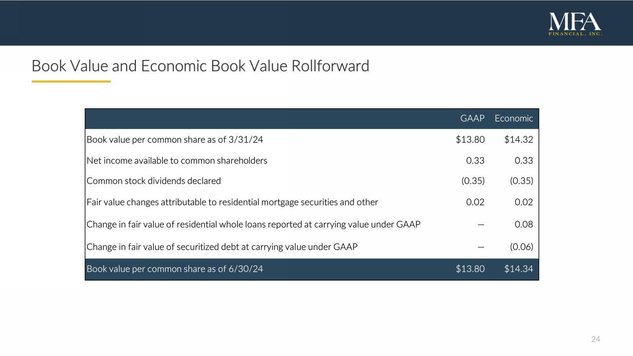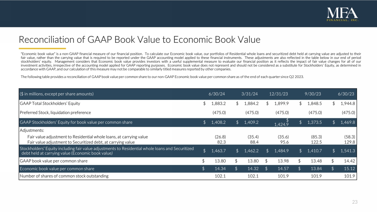 23 Reconciliation of GAAP Book Value to Economic Book Value “Economic book value” is a non - GAAP financial measure of our financial position . To calculate our Economic book value, our portfolios of Residential whole loans and securitized debt held at carrying value are adjusted to their fair value, rather than the carrying value that is required to be reported under the GAAP accounting model applied to these financial instruments . These adjustments are also reflected in the table below in our end of period stockholders’ equity . Management considers that Economic book value provides investors with a useful supplemental measure to evaluate our financial position as it reflects the impact of fair value changes for all of our investment activities, irrespective of the accounting model applied for GAAP reporting purposes . Economic book value does not represent and should not be considered as a substitute for Stockholders’ Equity, as determined in accordance with GAAP, and our calculation of this measure may not be comparable to similarly titled measures reported by other companies . The following table provides a reconciliation of GAAP book value per common share to our non - GAAP Economic book value per common share as of the end of each quarter since Q 2 2023 . ($ i n millions, except per share amounts) 6/30/24 3/31/24 12/31 /2 3 9/30 /2 3 6/30 /2 3 GAAP Total Stockholders’ Equity $ 1,883.2 $ 1,884.2 $ 1,899.9 $ 1,848.5 $ 1,944.8 Preferred Stock, liquidation preference (475.0) (475.0) (475.0) (475.0) (475.0) GAAP Stockholders’ Equity for book value per common share $ 1,408.2 $ 1,409.2 $ 1,424.9 $ 1,373.5 $ 1,469.8 Adjustments: Fair value adjustment to Residential whole loans, at carrying value (26.8) (35.4) (35.6) (85.3) (58.3) Fair value adjustment to Securitized debt, at carrying value 82.3 88.4 95.6 122.5 129.8 Stockholders’ Equity including fair value adjustments to Residential whole loans and Securitized debt held at carrying value (Economic book value ) $ 1,463.7 $ 1,462.2 $ 1,484.9 $ 1,410.7 $ 1,541.3 GAAP book value per common share $ 13.80 $ 13.80 $ 13.98 $ 13.48 $ 14.42 Economic book value per common share $ 14.34 $ 14.32 $ 14.57 $ 13.84 $ 15.12 Number of shares of common stock outstanding 102.1 102.1 101.9 101.9 101.9