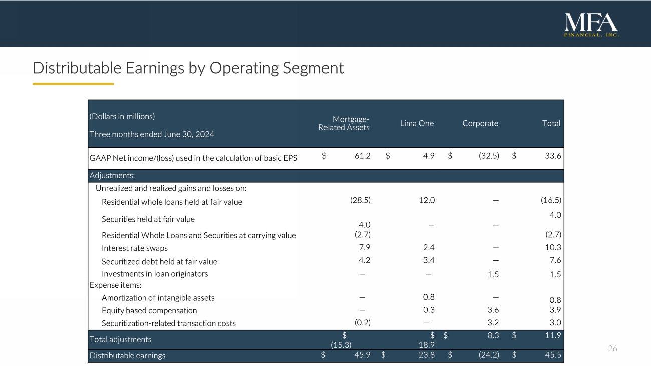 25 GAAP Segment Reporting (Dollars in m illions) Mortgage - Related Assets Lima One Corporate Total d Three months ended June 30, 2024 Interest Income $ 101.2 $ 81.7 $ 3.8 $ 186.7 1 Interest Expense 70.0 56.7 6.6 133.3 1 Net Interest Income /(Expense) $ 31.2 $ 25.0 $ (2.8) $ 53.4 1 Provision for Credit Losses on Other Assets - - - - 1 (Provision)/Reversal of Provision for Credit Losses on Residential Whole Loans 1.0 - - 1.0 1 Net Interest Income /(Expense) after Reversal of Provision/( Provision ) for Credit Losses $ 32.2 $ 25.0 $ (2.8) $ 54.4 4 Net gain/(loss) on residential whole loans measured at fair value through earnings 28.5 (12.0) - 16.5 1 Net Realized Loss on Residential Whole Loan Held at Carrying Value - - - - 1 Impairment and other net gain on securities and other portfolio investments (1.4) - (1.5) (2.9) 1 Net gain on real estate owned 2.2 (0.3) - 1.9 1 Net gain on derivatives used for risk management purposes 11.3 4.8 - 16.1 1 Net gain on securitized debt measured at fair value through earnings (6.6) (4.0) - (10.6) 1 Lima One - origination, servicing and other fee income - 7.6 - 7.6 1 Other, net (0.1) 0.9 0.5 1.3 1 Total Other Income/(Loss) , net $ 33.9 $ (3.0) $ (1.0) $ 29.9 1 Compensation and benefits - 10.8 11.0 21.8 1 General and administrative expenses 0.1 4.9 5.8 10.8 1 Loan servicing, financing, and other related costs 4.8 0.6 3.3 8.7 1 Amortization of intangible assets - 0.8 - 0.8 1 Income/(loss) before income taxes $ 61.2 $ 4.9 $ (23.9) $ 42.2 1 Provision for/(benefit from) income taxes - - 0.3 0.3 1 Net Income/(Loss) 61.2 4.9 (24.2) 41.9 1 Less Preferred Stock Dividend Requirement - - 8.2 8.2 1 Net Income/( Loss ) Available to Common Stock and Participating Securities $ 61.2 $ 4.9 $ (32.4) $ 33.7 1