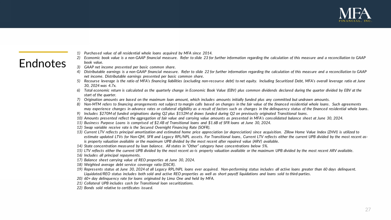 26 Distributable Earnings by Operating Segment (Dollars in m illions) Mortgage - Related Assets Lima One Corporate Total 1 Three months ended June 30, 2024 GAAP Net income/(loss) used in the calculation of basic EPS $ 61.2 $ 4.9 $ (32.5) $ 33.6 1 Adjustments: Unrealized and realized gains and losses on: Residential whole loans held at fair value (28.5) 12.0 — (16.5) 1 Securities held at fair value 4.0 — — 4.0 1 Residential Whole Loans and Securities at carrying value (2.7) (2.7) 1 Interest rate swaps 7.9 2.4 — 10.3 1 Securitized debt held at fair value 4.2 3.4 — 7.6 1 Investments in loan originators — — 1.5 1.5 1 Expense items: Amortization of intangible assets — 0.8 — 0.8 1 Equity based compensation — 0. 3 3.6 3.9 1 Securitization - related transaction costs (0.2) — 3.2 3.0 1 Total adjustments $ (15.3) $ 18.9 $ 8.3 $ 11.9 1 Distributable earnings $ 45.9 $ 23.8 $ (24.2) $ 45.5 1