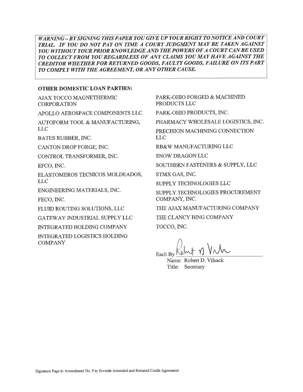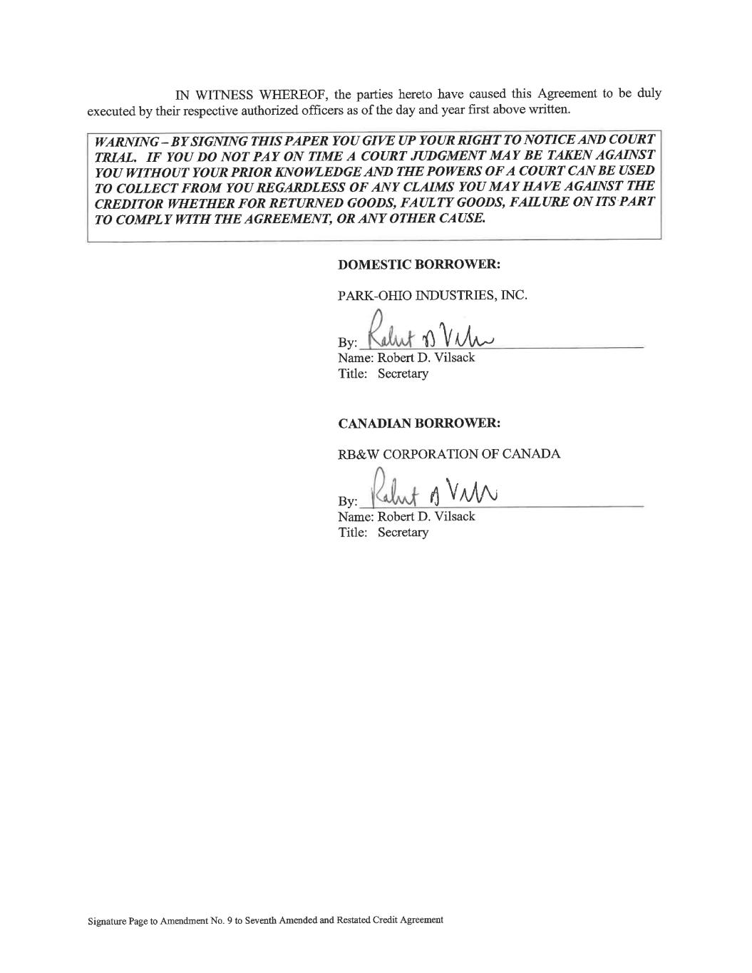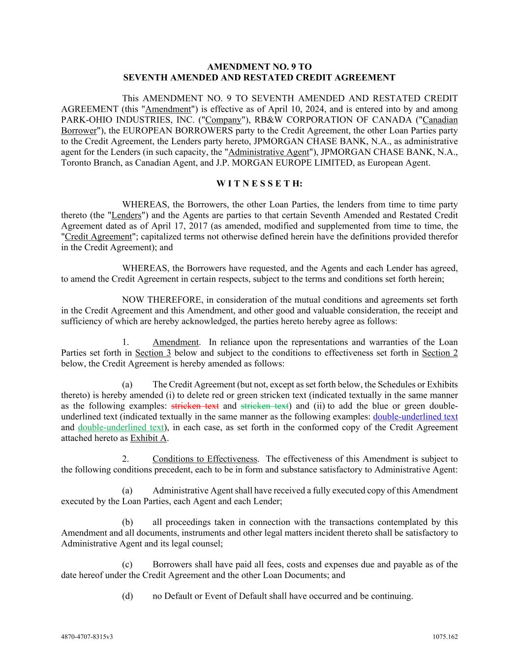 4870-4707-8315v3 1075.162 AMENDMENT NO. 9 TO SEVENTH AMENDED AND RESTATED CREDIT AGREEMENT This AMENDMENT NO. 9 TO SEVENTH AMENDED AND RESTATED CREDIT AGREEMENT (this "Amendment") is effective as of April 10, 2024, and is entered into by and among PARK-OHIO INDUSTRIES, INC. ("Company"), RB&W CORPORATION OF CANADA ("Canadian Borrower"), the EUROPEAN BORROWERS party to the Credit Agreement, the other Loan Parties party to the Credit Agreement, the Lenders party hereto, JPMORGAN CHASE BANK, N.A., as administrative agent for the Lenders (in such capacity, the "Administrative Agent"), JPMORGAN CHASE BANK, N.A., Toronto Branch, as Canadian Agent, and J.P. MORGAN EUROPE LIMITED, as European Agent. W I T N E S S E T H: WHEREAS, the Borrowers, the other Loan Parties, the lenders from time to time party thereto (the "Lenders") and the Agents are parties to that certain Seventh Amended and Restated Credit Agreement dated as of April 17, 2017 (as amended, modified and supplemented from time to time, the "Credit Agreement"; capitalized terms not otherwise defined herein have the definitions provided therefor in the Credit Agreement); and WHEREAS, the Borrowers have requested, and the Agents and each Lender has agreed, to amend the Credit Agreement in certain respects, subject to the terms and conditions set forth herein; NOW THEREFORE, in consideration of the mutual conditions and agreements set forth in the Credit Agreement and this Amendment, and other good and valuable consideration, the receipt and sufficiency of which are hereby acknowledged, the parties hereto hereby agree as follows: 1. Amendment. In reliance upon the representations and warranties of the Loan Parties set forth in Section 3 below and subject to the conditions to effectiveness set forth in Section 2 below, the Credit Agreement is hereby amended as follows: (a) The Credit Agreement (but not, except as set forth below, the Schedules or Exhibits thereto) is hereby amended (i) to delete red or green stricken text (indicated textually in the same manner as the following examples: stricken text and stricken text) and (ii) to add the blue or green double- underlined text (indicated textually in the same manner as the following examples: double-underlined text and double-underlined text), in each case, as set forth in the conformed copy of the Credit Agreement attached hereto as Exhibit A. 2. Conditions to Effectiveness. The effectiveness of this Amendment is subject to the following conditions precedent, each to be in form and substance satisfactory to Administrative Agent: (a) Administrative Agent shall have received a fully executed copy of this Amendment executed by the Loan Parties, each Agent and each Lender; (b) all proceedings taken in connection with the transactions contemplated by this Amendment and all documents, instruments and other legal matters incident thereto shall be satisfactory to Administrative Agent and its legal counsel; (c) Borrowers shall have paid all fees, costs and expenses due and payable as of the date hereof under the Credit Agreement and the other Loan Documents; and (d) no Default or Event of Default shall have occurred and be continuing.