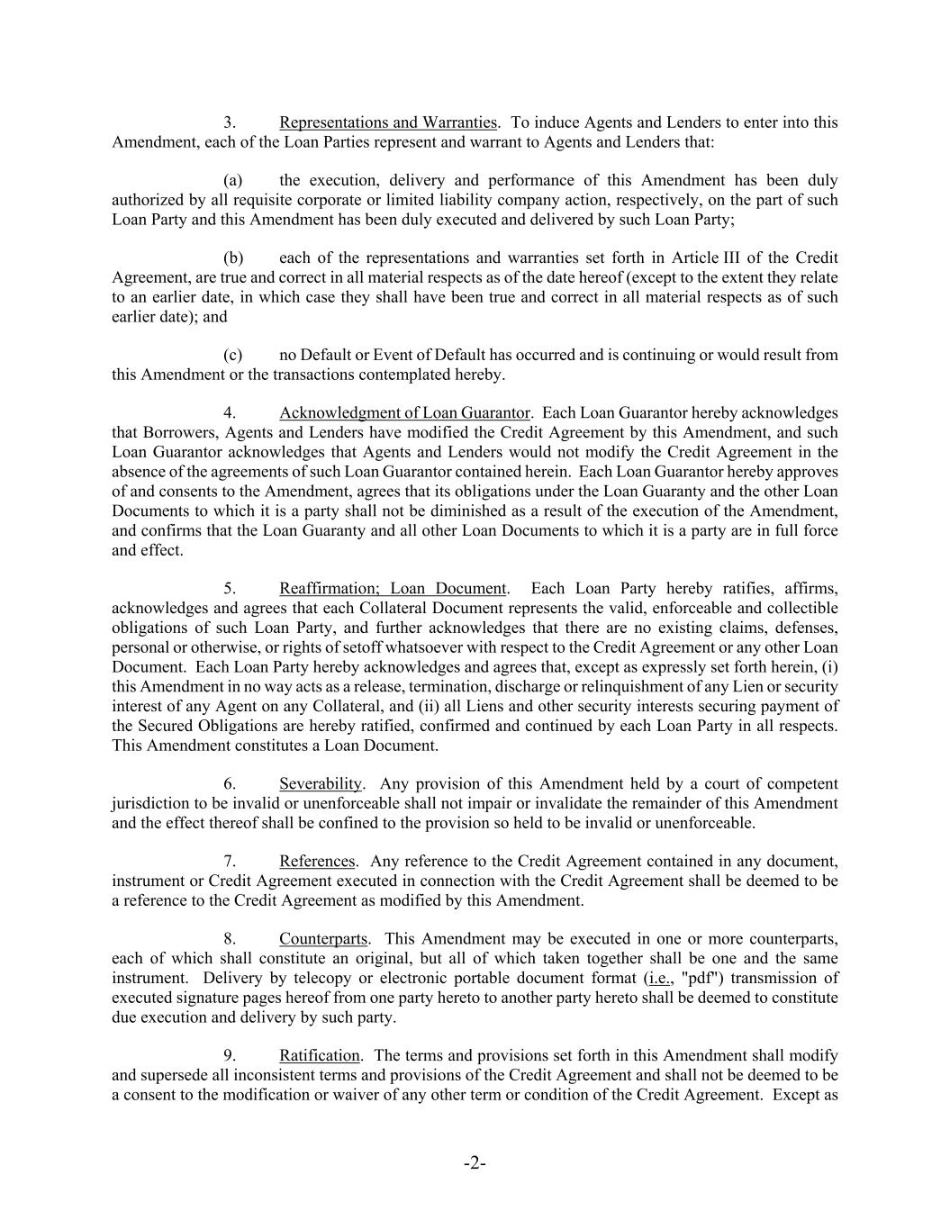 -2- 3. Representations and Warranties. To induce Agents and Lenders to enter into this Amendment, each of the Loan Parties represent and warrant to Agents and Lenders that: (a) the execution, delivery and performance of this Amendment has been duly authorized by all requisite corporate or limited liability company action, respectively, on the part of such Loan Party and this Amendment has been duly executed and delivered by such Loan Party; (b) each of the representations and warranties set forth in Article III of the Credit Agreement, are true and correct in all material respects as of the date hereof (except to the extent they relate to an earlier date, in which case they shall have been true and correct in all material respects as of such earlier date); and (c) no Default or Event of Default has occurred and is continuing or would result from this Amendment or the transactions contemplated hereby. 4. Acknowledgment of Loan Guarantor. Each Loan Guarantor hereby acknowledges that Borrowers, Agents and Lenders have modified the Credit Agreement by this Amendment, and such Loan Guarantor acknowledges that Agents and Lenders would not modify the Credit Agreement in the absence of the agreements of such Loan Guarantor contained herein. Each Loan Guarantor hereby approves of and consents to the Amendment, agrees that its obligations under the Loan Guaranty and the other Loan Documents to which it is a party shall not be diminished as a result of the execution of the Amendment, and confirms that the Loan Guaranty and all other Loan Documents to which it is a party are in full force and effect. 5. Reaffirmation; Loan Document. Each Loan Party hereby ratifies, affirms, acknowledges and agrees that each Collateral Document represents the valid, enforceable and collectible obligations of such Loan Party, and further acknowledges that there are no existing claims, defenses, personal or otherwise, or rights of setoff whatsoever with respect to the Credit Agreement or any other Loan Document. Each Loan Party hereby acknowledges and agrees that, except as expressly set forth herein, (i) this Amendment in no way acts as a release, termination, discharge or relinquishment of any Lien or security interest of any Agent on any Collateral, and (ii) all Liens and other security interests securing payment of the Secured Obligations are hereby ratified, confirmed and continued by each Loan Party in all respects. This Amendment constitutes a Loan Document. 6. Severability. Any provision of this Amendment held by a court of competent jurisdiction to be invalid or unenforceable shall not impair or invalidate the remainder of this Amendment and the effect thereof shall be confined to the provision so held to be invalid or unenforceable. 7. References. Any reference to the Credit Agreement contained in any document, instrument or Credit Agreement executed in connection with the Credit Agreement shall be deemed to be a reference to the Credit Agreement as modified by this Amendment. 8. Counterparts. This Amendment may be executed in one or more counterparts, each of which shall constitute an original, but all of which taken together shall be one and the same instrument. Delivery by telecopy or electronic portable document format (i.e., "pdf") transmission of executed signature pages hereof from one party hereto to another party hereto shall be deemed to constitute due execution and delivery by such party. 9. Ratification. The terms and provisions set forth in this Amendment shall modify and supersede all inconsistent terms and provisions of the Credit Agreement and shall not be deemed to be a consent to the modification or waiver of any other term or condition of the Credit Agreement. Except as