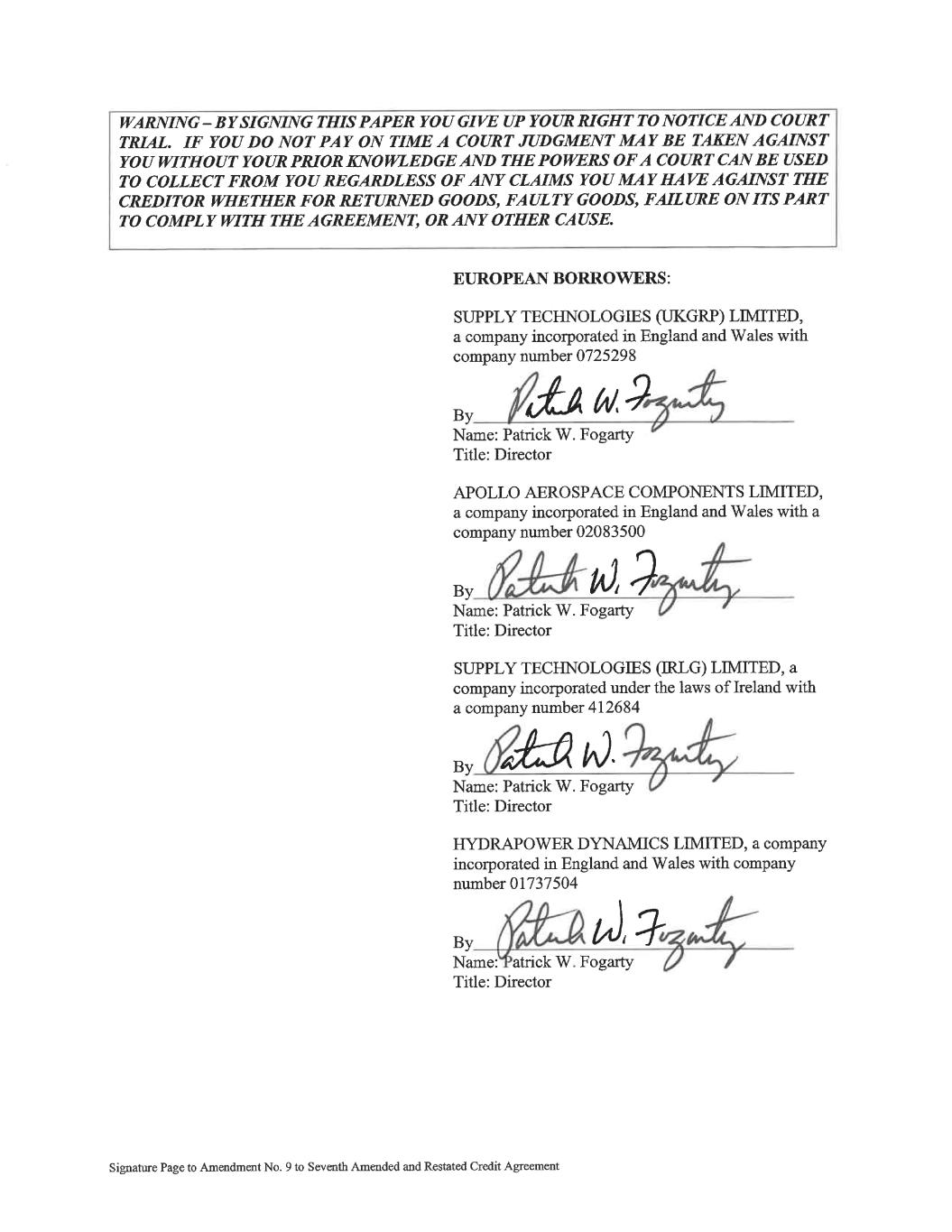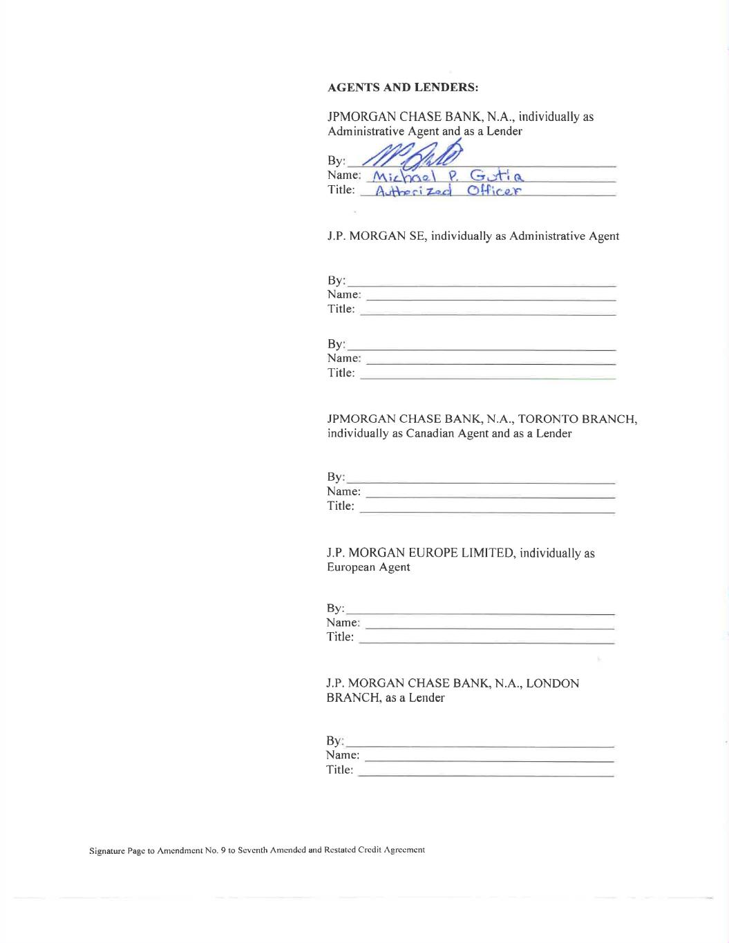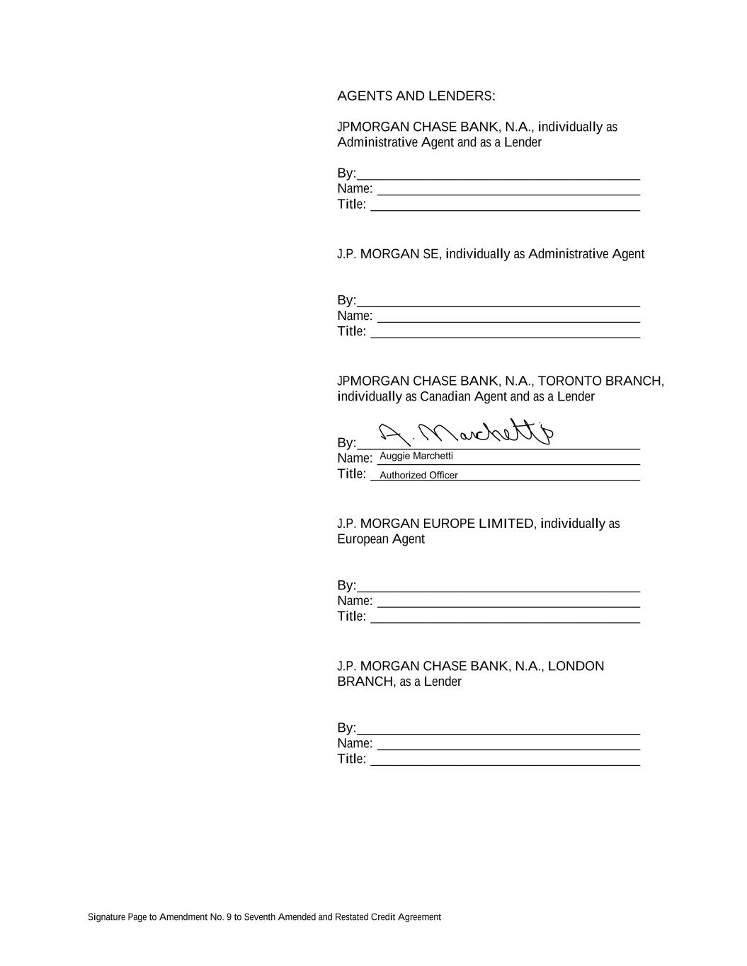 Signature Page to Amendment No. 9 to Seventh Amended and Restated Credit Agreement AGENTS AND LENDERS: JPMORGAN CHASE BANK, N.A., individually as Administrative Agent and as a Lender By: __________________________________________ Name: _______________________________________ Title: ________________________________________ J.P. MORGAN SE, individually as Administrative Agent By: __________________________________________ Name: _______________________________________ Title: ________________________________________ JPMORGAN CHASE BANK, N.A., TORONTO BRANCH, individually as Canadian Agent and as a Lender By: __________________________________________ Name: _______________________________________ Title: ________________________________________ J.P. MORGAN EUROPE LIMITED, individually as European Agent By: __________________________________________ Name: _______________________________________ Title: ________________________________________ J.P. MORGAN CHASE BANK, N.A., LONDON BRANCH, as a Lender By: __________________________________________ Name: _______________________________________ Title: ________________________________________ Auggie Marchetti Authorized Officer