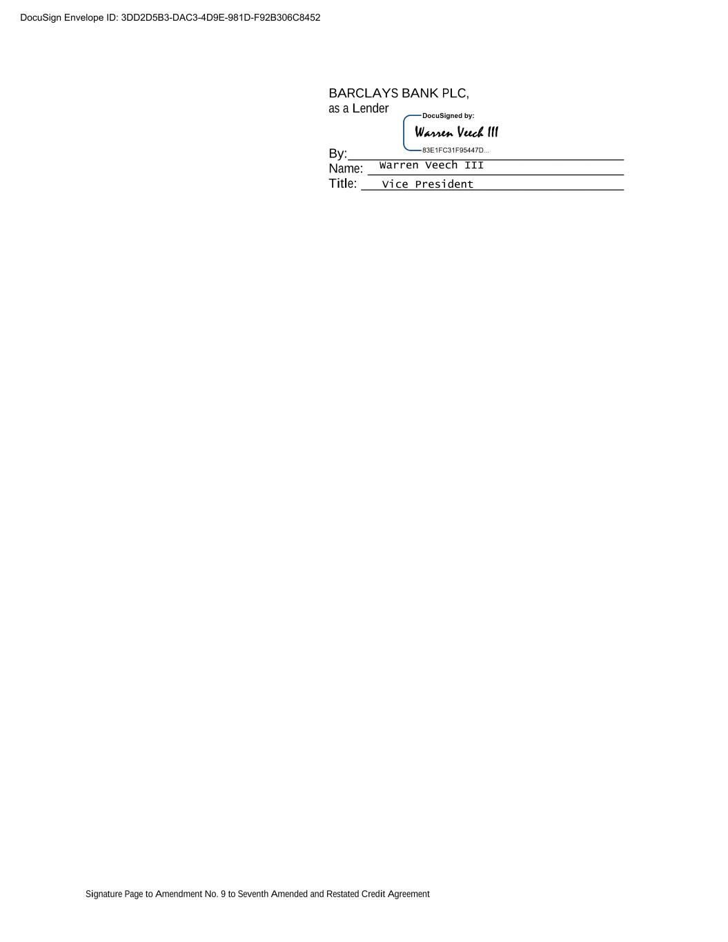 Signature Page to Amendment No. 9 to Seventh Amended and Restated Credit Agreement BARCLAYS BANK PLC, as a Lender By: __________________________________________ Name: _______________________________________ Title: ________________________________________ DocuSign Envelope ID: 3DD2D5B3-DAC3-4D9E-981D-F92B306C8452 Vice President Warren Veech III