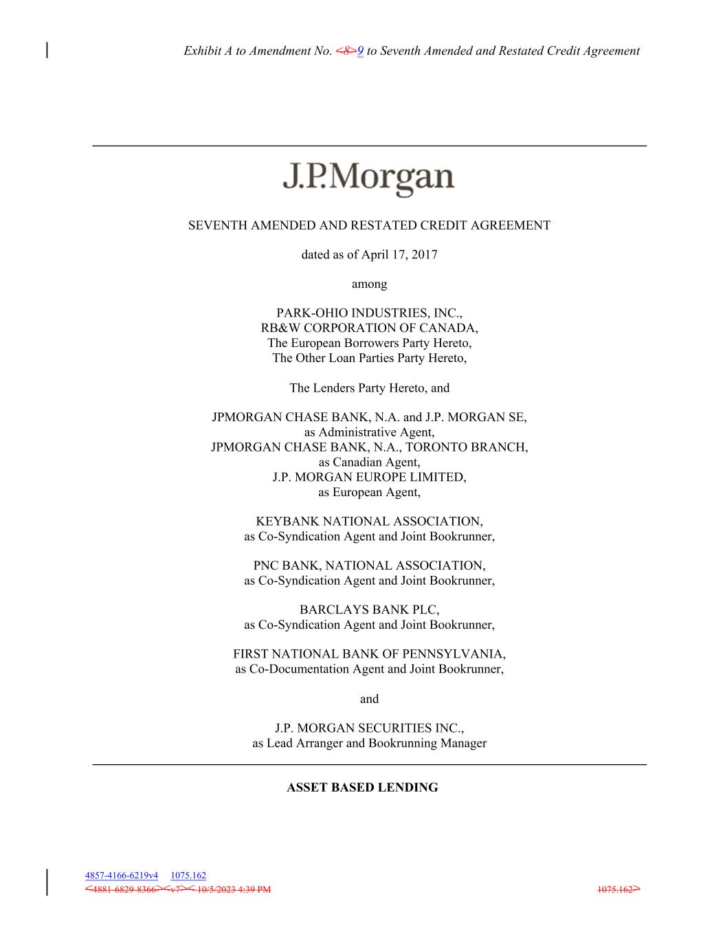 Exhibit A to Amendment No. <8>9 to Seventh Amended and Restated Credit Agreement 4857-4166-6219v4 1075.162 <4881-6829-8366><v7>< 10/5/2023 4:39 PM 1075.162> SEVENTH AMENDED AND RESTATED CREDIT AGREEMENT dated as of April 17, 2017 among PARK-OHIO INDUSTRIES, INC., RB&W CORPORATION OF CANADA, The European Borrowers Party Hereto, The Other Loan Parties Party Hereto, The Lenders Party Hereto, and JPMORGAN CHASE BANK, N.A. and J.P. MORGAN SE, as Administrative Agent, JPMORGAN CHASE BANK, N.A., TORONTO BRANCH, as Canadian Agent, J.P. MORGAN EUROPE LIMITED, as European Agent, KEYBANK NATIONAL ASSOCIATION, as Co-Syndication Agent and Joint Bookrunner, PNC BANK, NATIONAL ASSOCIATION, as Co-Syndication Agent and Joint Bookrunner, BARCLAYS BANK PLC, as Co-Syndication Agent and Joint Bookrunner, FIRST NATIONAL BANK OF PENNSYLVANIA, as Co-Documentation Agent and Joint Bookrunner, and J.P. MORGAN SECURITIES INC., as Lead Arranger and Bookrunning Manager ASSET BASED LENDING