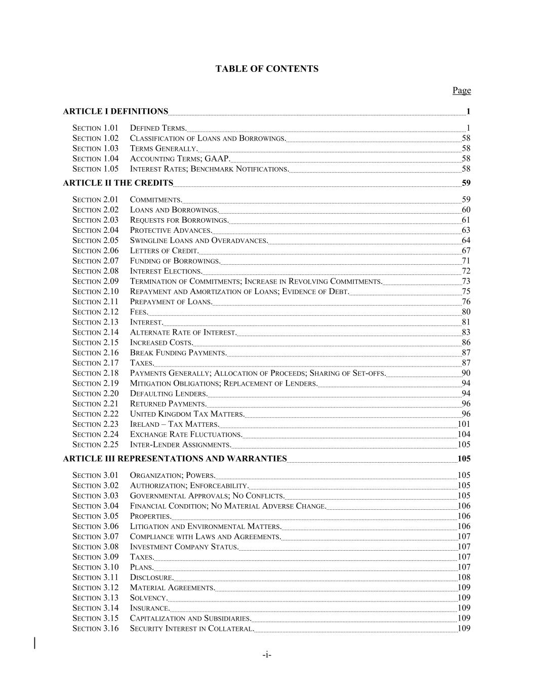 TABLE OF CONTENTS Page ARTICLE I DEFINITIONS 1 SECTION 1.01 DEFINED TERMS. 1 SECTION 1.02 CLASSIFICATION OF LOANS AND BORROWINGS. 58 SECTION 1.03 TERMS GENERALLY. 58 SECTION 1.04 ACCOUNTING TERMS; GAAP. 58 SECTION 1.05 INTEREST RATES; BENCHMARK NOTIFICATIONS. 58 ARTICLE II THE CREDITS 59 SECTION 2.01 COMMITMENTS. 59 SECTION 2.02 LOANS AND BORROWINGS. 60 SECTION 2.03 REQUESTS FOR BORROWINGS. 61 SECTION 2.04 PROTECTIVE ADVANCES. 63 SECTION 2.05 SWINGLINE LOANS AND OVERADVANCES. 64 SECTION 2.06 LETTERS OF CREDIT. 67 SECTION 2.07 FUNDING OF BORROWINGS. 71 SECTION 2.08 INTEREST ELECTIONS. 72 SECTION 2.09 TERMINATION OF COMMITMENTS; INCREASE IN REVOLVING COMMITMENTS. 73 SECTION 2.10 REPAYMENT AND AMORTIZATION OF LOANS; EVIDENCE OF DEBT. 75 SECTION 2.11 PREPAYMENT OF LOANS. 76 SECTION 2.12 FEES. 80 SECTION 2.13 INTEREST. 81 SECTION 2.14 ALTERNATE RATE OF INTEREST. 83 SECTION 2.15 INCREASED COSTS. 86 SECTION 2.16 BREAK FUNDING PAYMENTS. 87 SECTION 2.17 TAXES. 87 SECTION 2.18 PAYMENTS GENERALLY; ALLOCATION OF PROCEEDS; SHARING OF SET-OFFS. 90 SECTION 2.19 MITIGATION OBLIGATIONS; REPLACEMENT OF LENDERS. 94 SECTION 2.20 DEFAULTING LENDERS. 94 SECTION 2.21 RETURNED PAYMENTS. 96 SECTION 2.22 UNITED KINGDOM TAX MATTERS. 96 SECTION 2.23 IRELAND – TAX MATTERS. 101 SECTION 2.24 EXCHANGE RATE FLUCTUATIONS. 104 SECTION 2.25 INTER-LENDER ASSIGNMENTS. 105 ARTICLE III REPRESENTATIONS AND WARRANTIES 105 SECTION 3.01 ORGANIZATION; POWERS. 105 SECTION 3.02 AUTHORIZATION; ENFORCEABILITY. 105 SECTION 3.03 GOVERNMENTAL APPROVALS; NO CONFLICTS. 105 SECTION 3.04 FINANCIAL CONDITION; NO MATERIAL ADVERSE CHANGE. 106 SECTION 3.05 PROPERTIES. 106 SECTION 3.06 LITIGATION AND ENVIRONMENTAL MATTERS. 106 SECTION 3.07 COMPLIANCE WITH LAWS AND AGREEMENTS. 107 SECTION 3.08 INVESTMENT COMPANY STATUS. 107 SECTION 3.09 TAXES. 107 SECTION 3.10 PLANS. 107 SECTION 3.11 DISCLOSURE. 108 SECTION 3.12 MATERIAL AGREEMENTS. 109 SECTION 3.13 SOLVENCY. 109 SECTION 3.14 INSURANCE. 109 SECTION 3.15 CAPITALIZATION AND SUBSIDIARIES. 109 SECTION 3.16 SECURITY INTEREST IN COLLATERAL. 109 -i-