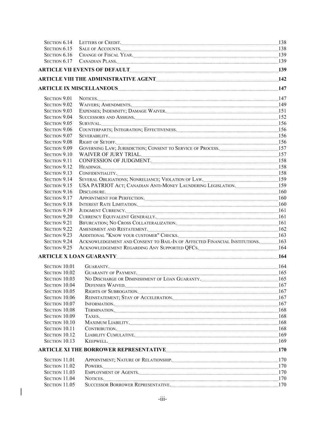 SECTION 6.14 LETTERS OF CREDIT. 138 SECTION 6.15 SALE OF ACCOUNTS. 138 SECTION 6.16 CHANGE OF FISCAL YEAR. 139 SECTION 6.17 CANADIAN PLANS. 139 ARTICLE VII EVENTS OF DEFAULT 139 ARTICLE VIII THE ADMINISTRATIVE AGENT 142 ARTICLE IX MISCELLANEOUS 147 SECTION 9.01 NOTICES. 147 SECTION 9.02 WAIVERS; AMENDMENTS. 149 SECTION 9.03 EXPENSES; INDEMNITY; DAMAGE WAIVER. 151 SECTION 9.04 SUCCESSORS AND ASSIGNS. 152 SECTION 9.05 SURVIVAL. 156 SECTION 9.06 COUNTERPARTS; INTEGRATION; EFFECTIVENESS. 156 SECTION 9.07 SEVERABILITY. 156 SECTION 9.08 RIGHT OF SETOFF. 156 SECTION 9.09 GOVERNING LAW; JURISDICTION; CONSENT TO SERVICE OF PROCESS. 157 SECTION 9.10 WAIVER OF JURY TRIAL. 157 SECTION 9.11 CONFESSION OF JUDGMENT. 158 SECTION 9.12 HEADINGS. 158 SECTION 9.13 CONFIDENTIALITY. 158 SECTION 9.14 SEVERAL OBLIGATIONS; NONRELIANCE; VIOLATION OF LAW. 159 SECTION 9.15 USA PATRIOT ACT; CANADIAN ANTI-MONEY LAUNDERING LEGISLATION. 159 SECTION 9.16 DISCLOSURE. 160 SECTION 9.17 APPOINTMENT FOR PERFECTION. 160 SECTION 9.18 INTEREST RATE LIMITATION. 160 SECTION 9.19 JUDGMENT CURRENCY. 161 SECTION 9.20 CURRENCY EQUIVALENT GENERALLY. 161 SECTION 9.21 BIFURCATION; NO CROSS COLLATERALIZATION. 161 SECTION 9.22 AMENDMENT AND RESTATEMENT. 162 SECTION 9.23 ADDITIONAL "KNOW YOUR CUSTOMER" CHECKS. 163 SECTION 9.24 ACKNOWLEDGEMENT AND CONSENT TO BAIL-IN OF AFFECTED FINANCIAL INSTITUTIONS. 163 SECTION 9.25 ACKNOWLEDGEMENT REGARDING ANY SUPPORTED QFCS. 164 ARTICLE X LOAN GUARANTY 164 SECTION 10.01 GUARANTY. 164 SECTION 10.02 GUARANTY OF PAYMENT. 165 SECTION 10.03 NO DISCHARGE OR DIMINISHMENT OF LOAN GUARANTY. 165 SECTION 10.04 DEFENSES WAIVED. 167 SECTION 10.05 RIGHTS OF SUBROGATION. 167 SECTION 10.06 REINSTATEMENT; STAY OF ACCELERATION. 167 SECTION 10.07 INFORMATION. 167 SECTION 10.08 TERMINATION. 168 SECTION 10.09 TAXES. 168 SECTION 10.10 MAXIMUM LIABILITY. 168 SECTION 10.11 CONTRIBUTION. 168 SECTION 10.12 LIABILITY CUMULATIVE. 169 SECTION 10.13 KEEPWELL. 169 ARTICLE XI THE BORROWER REPRESENTATIVE 170 SECTION 11.01 APPOINTMENT; NATURE OF RELATIONSHIP. 170 SECTION 11.02 POWERS. 170 SECTION 11.03 EMPLOYMENT OF AGENTS. 170 SECTION 11.04 NOTICES. 170 SECTION 11.05 SUCCESSOR BORROWER REPRESENTATIVE. 170 -iii-