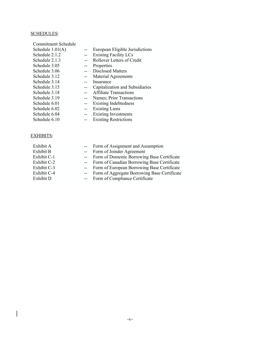 -v- Schedule 6.01 Disclosed Matters -- Existing Indebtedness SCHEDULES: Schedule 6.02 Schedule 3.12 -- Schedule 2.1.2 Schedule 2.1.3 Existing Liens -- Schedule 6.04 Material Agreements -- -- -- Existing Investments Schedule 6.10 Schedule 3.14 -- Existing Facility LCs Rollover Letters of Credit Existing Restrictions -- EXHIBITS: Exhibit A Insurance -- Form of Assignment and Assumption Exhibit B Schedule 3.15 -- Schedule 3.05 Form of Joinder Agreement -- Schedule 1.01(A) Exhibit C-1 Capitalization and Subsidiaries -- -- Form of Domestic Borrowing Base Certificate Commitment Schedule Exhibit C-2 Schedule 3.18 -- Properties Form of Canadian Borrowing Base Certificate -- -- Exhibit C-3 Affiliate Transactions -- Form of European Borrowing Base Certificate Exhibit C-4 Schedule 3.19 -- Schedule 3.06 Form of Aggregate Borrowing Base Certificate -- European Eligible Jurisdictions Exhibit D Names; Prior Transactions -- -- Form of Compliance Certificate
