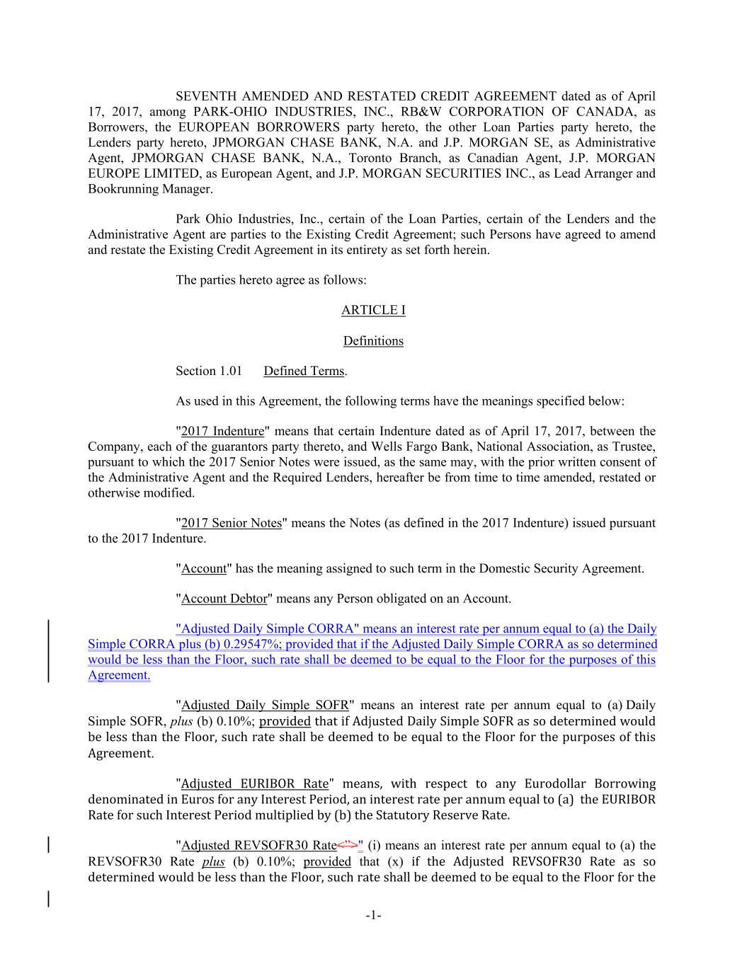 SEVENTH AMENDED AND RESTATED CREDIT AGREEMENT dated as of April 17, 2017, among PARK-OHIO INDUSTRIES, INC., RB&W CORPORATION OF CANADA, as Borrowers, the EUROPEAN BORROWERS party hereto, the other Loan Parties party hereto, the Lenders party hereto, JPMORGAN CHASE BANK, N.A. and J.P. MORGAN SE, as Administrative Agent, JPMORGAN CHASE BANK, N.A., Toronto Branch, as Canadian Agent, J.P. MORGAN EUROPE LIMITED, as European Agent, and J.P. MORGAN SECURITIES INC., as Lead Arranger and Bookrunning Manager. Park Ohio Industries, Inc., certain of the Loan Parties, certain of the Lenders and the Administrative Agent are parties to the Existing Credit Agreement; such Persons have agreed to amend and restate the Existing Credit Agreement in its entirety as set forth herein. The parties hereto agree as follows: ARTICLE I Definitions Section 1.01 Defined Terms. As used in this Agreement, the following terms have the meanings specified below: "2017 Indenture" means that certain Indenture dated as of April 17, 2017, between the Company, each of the guarantors party thereto, and Wells Fargo Bank, National Association, as Trustee, pursuant to which the 2017 Senior Notes were issued, as the same may, with the prior written consent of the Administrative Agent and the Required Lenders, hereafter be from time to time amended, restated or otherwise modified. "2017 Senior Notes" means the Notes (as defined in the 2017 Indenture) issued pursuant to the 2017 Indenture. "Account" has the meaning assigned to such term in the Domestic Security Agreement. "Account Debtor" means any Person obligated on an Account. "Adjusted Daily Simple CORRA" means an interest rate per annum equal to (a) the Daily Simple CORRA plus (b) 0.29547%; provided that if the Adjusted Daily Simple CORRA as so determined would be less than the Floor, such rate shall be deemed to be equal to the Floor for the purposes of this Agreement. "Adjusted Daily Simple SOFR" means an interest rate per annum equal to (a) Daily Simple SOFR, plus (b) 0.10%; provided that if Adjusted Daily Simple SOFR as so determined would be less than the Floor, such rate shall be deemed to be equal to the Floor for the purposes of this Agreement. "Adjusted EURIBOR Rate" means, with respect to any Eurodollar Borrowing denominated in Euros for any Interest Period, an interest rate per annum equal to (a) the EURIBOR Rate for such Interest Period multiplied by (b) the Statutory Reserve Rate. "Adjusted REVSOFR30 Rate<”>" (i) means an interest rate per annum equal to (a) the REVSOFR30 Rate plus (b) 0.10%; provided that (x) if the Adjusted REVSOFR30 Rate as so determined would be less than the Floor, such rate shall be deemed to be equal to the Floor for the -1-