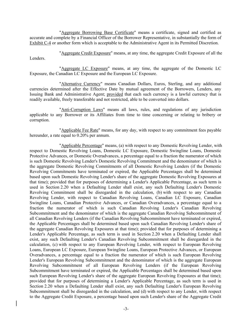 "Aggregate Borrowing Base Certificate" means a certificate, signed and certified as accurate and complete by a Financial Officer of the Borrower Representative, in substantially the form of Exhibit C-4 or another form which is acceptable to the Administrative Agent in its Permitted Discretion. "Aggregate Credit Exposure" means, at any time, the aggregate Credit Exposure of all the Lenders. "Aggregate LC Exposure" means, at any time, the aggregate of the Domestic LC Exposure, the Canadian LC Exposure and the European LC Exposure. "Alternative Currency" means Canadian Dollars, Euros, Sterling, and any additional currencies determined after the Effective Date by mutual agreement of the Borrowers, Lenders, any Issuing Bank and Administrative Agent; provided that each such currency is a lawful currency that is readily available, freely transferable and not restricted, able to be converted into dollars. "Anti-Corruption Laws" means all laws, rules, and regulations of any jurisdiction applicable to any Borrower or its Affiliates from time to time concerning or relating to bribery or corruption. "Applicable Fee Rate" means, for any day, with respect to any commitment fees payable hereunder, a rate equal to 0.20% per annum. "Applicable Percentage" means, (a) with respect to any Domestic Revolving Lender, with respect to Domestic Revolving Loans, Domestic LC Exposure, Domestic Swingline Loans, Domestic Protective Advances, or Domestic Overadvances, a percentage equal to a fraction the numerator of which is such Domestic Revolving Lender's Domestic Revolving Commitment and the denominator of which is the aggregate Domestic Revolving Commitments of all Domestic Revolving Lenders (if the Domestic Revolving Commitments have terminated or expired, the Applicable Percentages shall be determined based upon such Domestic Revolving Lender's share of the aggregate Domestic Revolving Exposures at that time); provided that for purposes of determining a Lender's Applicable Percentage, as such term is used in Section 2.20 when a Defaulting Lender shall exist, any such Defaulting Lender's Domestic Revolving Commitment shall be disregarded in the calculation, (b) with respect to any Canadian Revolving Lender, with respect to Canadian Revolving Loans, Canadian LC Exposure, Canadian Swingline Loans, Canadian Protective Advances, or Canadian Overadvances, a percentage equal to a fraction the numerator of which is such Canadian Revolving Lender's Canadian Revolving Subcommitment and the denominator of which is the aggregate Canadian Revolving Subcommitment of all Canadian Revolving Lenders (if the Canadian Revolving Subcommitment have terminated or expired, the Applicable Percentages shall be determined based upon such Canadian Revolving Lender's share of the aggregate Canadian Revolving Exposures at that time); provided that for purposes of determining a Lender's Applicable Percentage, as such term is used in Section 2.20 when a Defaulting Lender shall exist, any such Defaulting Lender's Canadian Revolving Subcommitment shall be disregarded in the calculation, (c) with respect to any European Revolving Lender, with respect to European Revolving Loans, European LC Exposure, European Swingline Loans, European Protective Advances, or European Overadvances, a percentage equal to a fraction the numerator of which is such European Revolving Lender's European Revolving Subcommitment and the denominator of which is the aggregate European Revolving Subcommitment of all European Revolving Lenders (if the European Revolving Subcommitment have terminated or expired, the Applicable Percentages shall be determined based upon such European Revolving Lender's share of the aggregate European Revolving Exposures at that time); provided that for purposes of determining a Lender's Applicable Percentage, as such term is used in Section 2.20 when a Defaulting Lender shall exist, any such Defaulting Lender's European Revolving Subcommitment shall be disregarded in the calculation, and (d) with respect to any Lender, with respect to the Aggregate Credit Exposure, a percentage based upon such Lender's share of the Aggregate Credit -3-