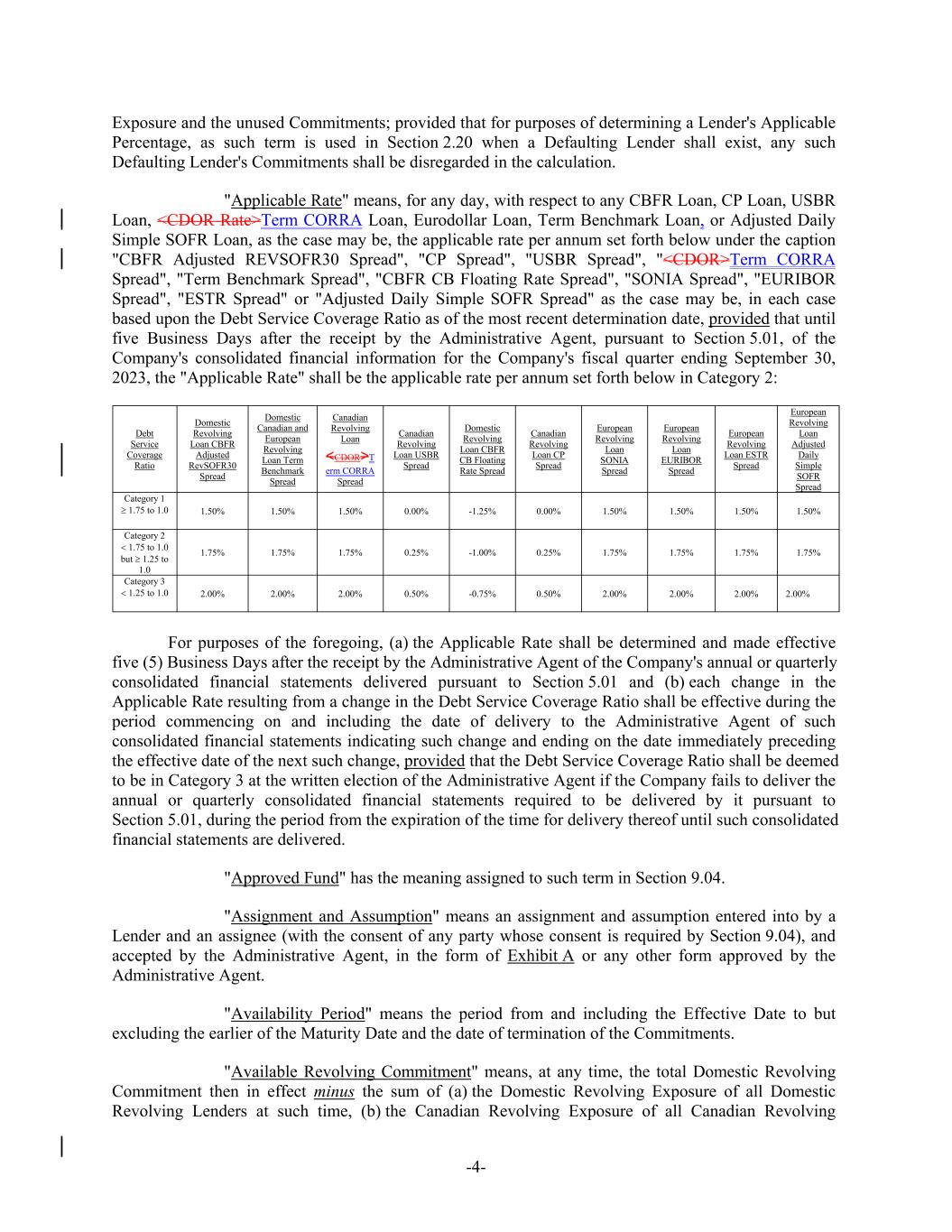-4- 1.50% European Revolving Loan ESTR Spread Category 2 1.75 to 1.0 but 1.25 to 1.0 European Revolving Loan Adjusted Daily Simple SOFR Spread 1.75% Canadian Revolving Loan <CDOR>T erm CORRA Spread 1.75% 1.75% 0.25% Category 1 1.75 to 1.0 -1.00% Canadian Revolving Loan USBR Spread 0.25% 1.50% 1.75% Debt Service Coverage Ratio 1.75% 1.50% 1.75% Domestic Revolving Loan CBFR CB Floating Rate Spread 1.75% 1.50% Category 3 1.25 to 1.0 0.00% 2.00% Canadian Revolving Loan CP Spread 2.00% -1.25% 2.00% Domestic Revolving Loan CBFR Adjusted RevSOFR30 Spread 0.50% 0.00% -0.75% European Revolving Loan SONIA Spread 0.50% 1.50% 2.00% Exposure and the unused Commitments; provided that for purposes of determining a Lender's Applicable Percentage, as such term is used in Section 2.20 when a Defaulting Lender shall exist, any such Defaulting Lender's Commitments shall be disregarded in the calculation. "Applicable Rate" means, for any day, with respect to any CBFR Loan, CP Loan, USBR Loan, <CDOR Rate>Term CORRA Loan, Eurodollar Loan, Term Benchmark Loan, or Adjusted Daily Simple SOFR Loan, as the case may be, the applicable rate per annum set forth below under the caption "CBFR Adjusted REVSOFR30 Spread", "CP Spread", "USBR Spread", "<CDOR>Term CORRA Spread", "Term Benchmark Spread", "CBFR CB Floating Rate Spread", "SONIA Spread", "EURIBOR Spread", "ESTR Spread" or "Adjusted Daily Simple SOFR Spread" as the case may be, in each case based upon the Debt Service Coverage Ratio as of the most recent determination date, provided that until five Business Days after the receipt by the Administrative Agent, pursuant to Section 5.01, of the Company's consolidated financial information for the Company's fiscal quarter ending September 30, 2023, the "Applicable Rate" shall be the applicable rate per annum set forth below in Category 2: 2.00% 1.50% 2.00% European Revolving Loan EURIBOR Spread 2.00% 1.50% For purposes of the foregoing, (a) the Applicable Rate shall be determined and made effective five (5) Business Days after the receipt by the Administrative Agent of the Company's annual or quarterly consolidated financial statements delivered pursuant to Section 5.01 and (b) each change in the Applicable Rate resulting from a change in the Debt Service Coverage Ratio shall be effective during the period commencing on and including the date of delivery to the Administrative Agent of such consolidated financial statements indicating such change and ending on the date immediately preceding the effective date of the next such change, provided that the Debt Service Coverage Ratio shall be deemed to be in Category 3 at the written election of the Administrative Agent if the Company fails to deliver the annual or quarterly consolidated financial statements required to be delivered by it pursuant to Section 5.01, during the period from the expiration of the time for delivery thereof until such consolidated financial statements are delivered. "Approved Fund" has the meaning assigned to such term in Section 9.04. "Assignment and Assumption" means an assignment and assumption entered into by a Lender and an assignee (with the consent of any party whose consent is required by Section 9.04), and accepted by the Administrative Agent, in the form of Exhibit A or any other form approved by the Administrative Agent. "Availability Period" means the period from and including the Effective Date to but excluding the earlier of the Maturity Date and the date of termination of the Commitments. "Available Revolving Commitment" means, at any time, the total Domestic Revolving Commitment then in effect minus the sum of (a) the Domestic Revolving Exposure of all Domestic Revolving Lenders at such time, (b) the Canadian Revolving Exposure of all Canadian Revolving Domestic Canadian and European Revolving Loan Term Benchmark Spread