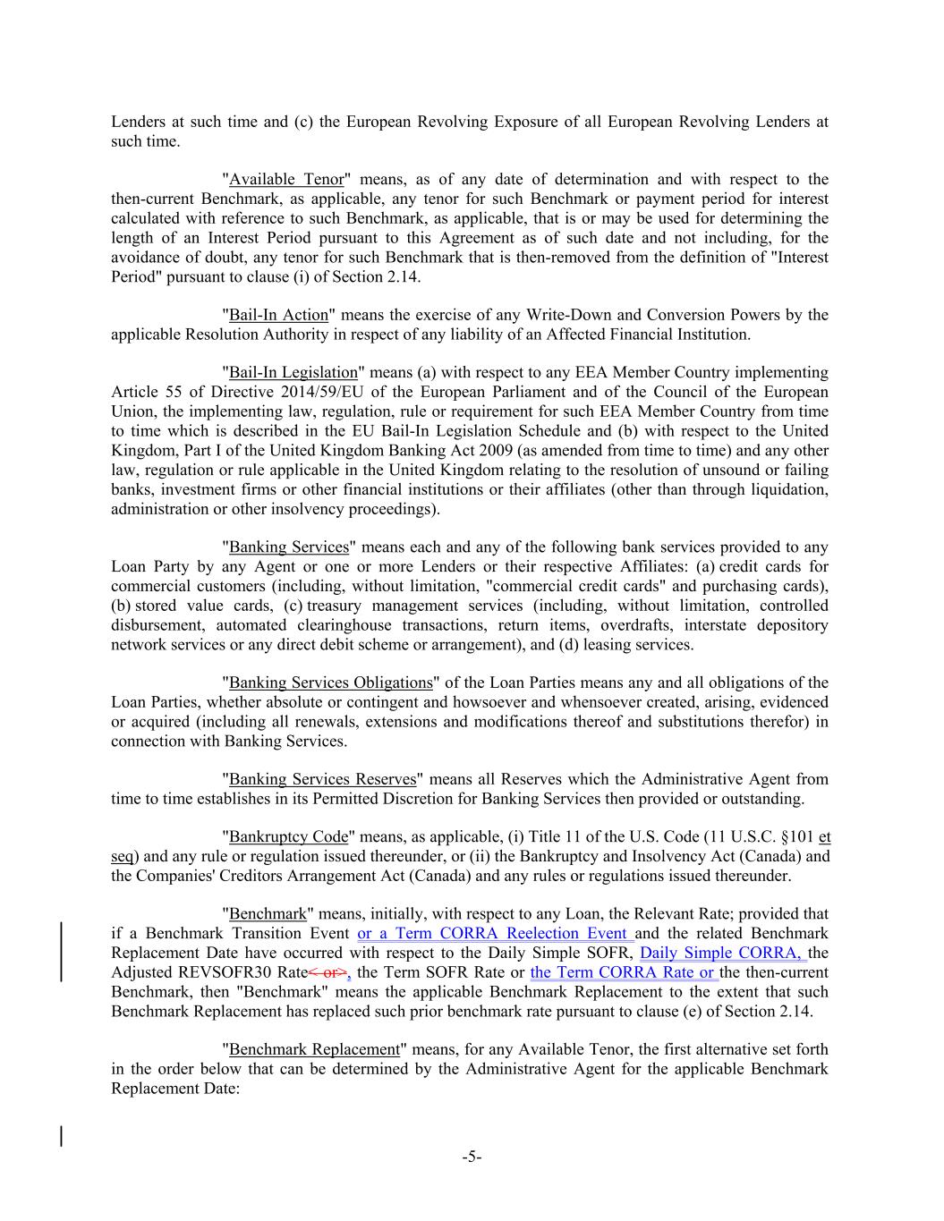 Lenders at such time and (c) the European Revolving Exposure of all European Revolving Lenders at such time. "Available Tenor" means, as of any date of determination and with respect to the then-current Benchmark, as applicable, any tenor for such Benchmark or payment period for interest calculated with reference to such Benchmark, as applicable, that is or may be used for determining the length of an Interest Period pursuant to this Agreement as of such date and not including, for the avoidance of doubt, any tenor for such Benchmark that is then-removed from the definition of "Interest Period" pursuant to clause (i) of Section 2.14. "Bail-In Action" means the exercise of any Write-Down and Conversion Powers by the applicable Resolution Authority in respect of any liability of an Affected Financial Institution. "Bail-In Legislation" means (a) with respect to any EEA Member Country implementing Article 55 of Directive 2014/59/EU of the European Parliament and of the Council of the European Union, the implementing law, regulation, rule or requirement for such EEA Member Country from time to time which is described in the EU Bail-In Legislation Schedule and (b) with respect to the United Kingdom, Part I of the United Kingdom Banking Act 2009 (as amended from time to time) and any other law, regulation or rule applicable in the United Kingdom relating to the resolution of unsound or failing banks, investment firms or other financial institutions or their affiliates (other than through liquidation, administration or other insolvency proceedings). "Banking Services" means each and any of the following bank services provided to any Loan Party by any Agent or one or more Lenders or their respective Affiliates: (a) credit cards for commercial customers (including, without limitation, "commercial credit cards" and purchasing cards), (b) stored value cards, (c) treasury management services (including, without limitation, controlled disbursement, automated clearinghouse transactions, return items, overdrafts, interstate depository network services or any direct debit scheme or arrangement), and (d) leasing services. "Banking Services Obligations" of the Loan Parties means any and all obligations of the Loan Parties, whether absolute or contingent and howsoever and whensoever created, arising, evidenced or acquired (including all renewals, extensions and modifications thereof and substitutions therefor) in connection with Banking Services. "Banking Services Reserves" means all Reserves which the Administrative Agent from time to time establishes in its Permitted Discretion for Banking Services then provided or outstanding. "Bankruptcy Code" means, as applicable, (i) Title 11 of the U.S. Code (11 U.S.C. §101 et seq) and any rule or regulation issued thereunder, or (ii) the Bankruptcy and Insolvency Act (Canada) and the Companies' Creditors Arrangement Act (Canada) and any rules or regulations issued thereunder. "Benchmark" means, initially, with respect to any Loan, the Relevant Rate; provided that if a Benchmark Transition Event or a Term CORRA Reelection Event and the related Benchmark Replacement Date have occurred with respect to the Daily Simple SOFR, Daily Simple CORRA, the Adjusted REVSOFR30 Rate< or>, the Term SOFR Rate or the Term CORRA Rate or the then-current Benchmark, then "Benchmark" means the applicable Benchmark Replacement to the extent that such Benchmark Replacement has replaced such prior benchmark rate pursuant to clause (e) of Section 2.14. "Benchmark Replacement" means, for any Available Tenor, the first alternative set forth in the order below that can be determined by the Administrative Agent for the applicable Benchmark Replacement Date: -5-