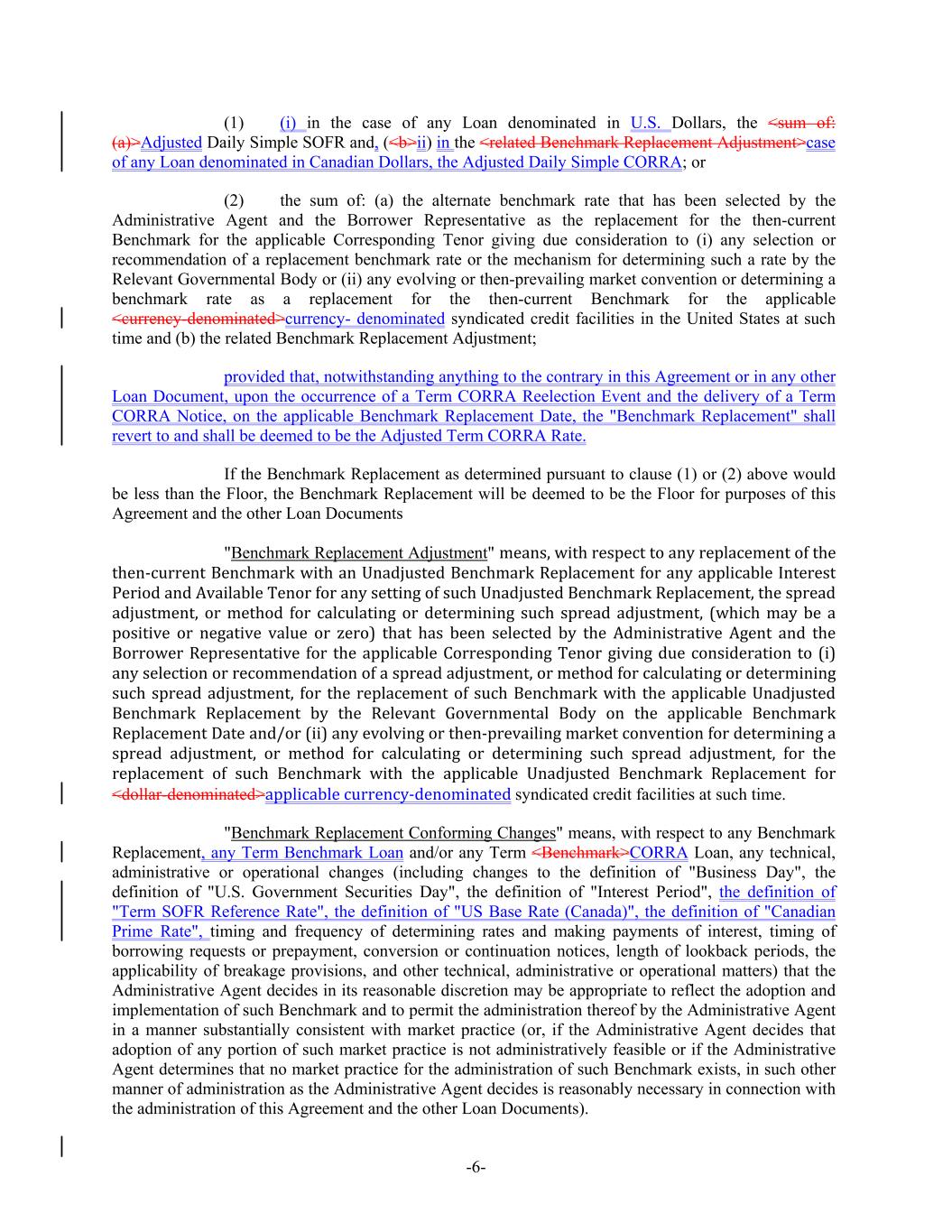 (1) (i) in the case of any Loan denominated in U.S. Dollars, the <sum of: (a)>Adjusted Daily Simple SOFR and, (<b>ii) in the <related Benchmark Replacement Adjustment>case of any Loan denominated in Canadian Dollars, the Adjusted Daily Simple CORRA; or (2) the sum of: (a) the alternate benchmark rate that has been selected by the Administrative Agent and the Borrower Representative as the replacement for the then-current Benchmark for the applicable Corresponding Tenor giving due consideration to (i) any selection or recommendation of a replacement benchmark rate or the mechanism for determining such a rate by the Relevant Governmental Body or (ii) any evolving or then-prevailing market convention or determining a benchmark rate as a replacement for the then-current Benchmark for the applicable <currency-denominated>currency- denominated syndicated credit facilities in the United States at such time and (b) the related Benchmark Replacement Adjustment; provided that, notwithstanding anything to the contrary in this Agreement or in any other Loan Document, upon the occurrence of a Term CORRA Reelection Event and the delivery of a Term CORRA Notice, on the applicable Benchmark Replacement Date, the "Benchmark Replacement" shall revert to and shall be deemed to be the Adjusted Term CORRA Rate. If the Benchmark Replacement as determined pursuant to clause (1) or (2) above would be less than the Floor, the Benchmark Replacement will be deemed to be the Floor for purposes of this Agreement and the other Loan Documents "Benchmark Replacement Adjustment" means, with respect to any replacement of the then-current Benchmark with an Unadjusted Benchmark Replacement for any applicable Interest Period and Available Tenor for any setting of such Unadjusted Benchmark Replacement, the spread adjustment, or method for calculating or determining such spread adjustment, (which may be a positive or negative value or zero) that has been selected by the Administrative Agent and the Borrower Representative for the applicable Corresponding Tenor giving due consideration to (i) any selection or recommendation of a spread adjustment, or method for calculating or determining such spread adjustment, for the replacement of such Benchmark with the applicable Unadjusted Benchmark Replacement by the Relevant Governmental Body on the applicable Benchmark Replacement Date and/or (ii) any evolving or then-prevailing market convention for determining a spread adjustment, or method for calculating or determining such spread adjustment, for the replacement of such Benchmark with the applicable Unadjusted Benchmark Replacement for <dollar-denominated>applicable currency-denominated syndicated credit facilities at such time. "Benchmark Replacement Conforming Changes" means, with respect to any Benchmark Replacement, any Term Benchmark Loan and/or any Term <Benchmark>CORRA Loan, any technical, administrative or operational changes (including changes to the definition of "Business Day", the definition of "U.S. Government Securities Day", the definition of "Interest Period", the definition of "Term SOFR Reference Rate", the definition of "US Base Rate (Canada)", the definition of "Canadian Prime Rate", timing and frequency of determining rates and making payments of interest, timing of borrowing requests or prepayment, conversion or continuation notices, length of lookback periods, the applicability of breakage provisions, and other technical, administrative or operational matters) that the Administrative Agent decides in its reasonable discretion may be appropriate to reflect the adoption and implementation of such Benchmark and to permit the administration thereof by the Administrative Agent in a manner substantially consistent with market practice (or, if the Administrative Agent decides that adoption of any portion of such market practice is not administratively feasible or if the Administrative Agent determines that no market practice for the administration of such Benchmark exists, in such other manner of administration as the Administrative Agent decides is reasonably necessary in connection with the administration of this Agreement and the other Loan Documents). -6-