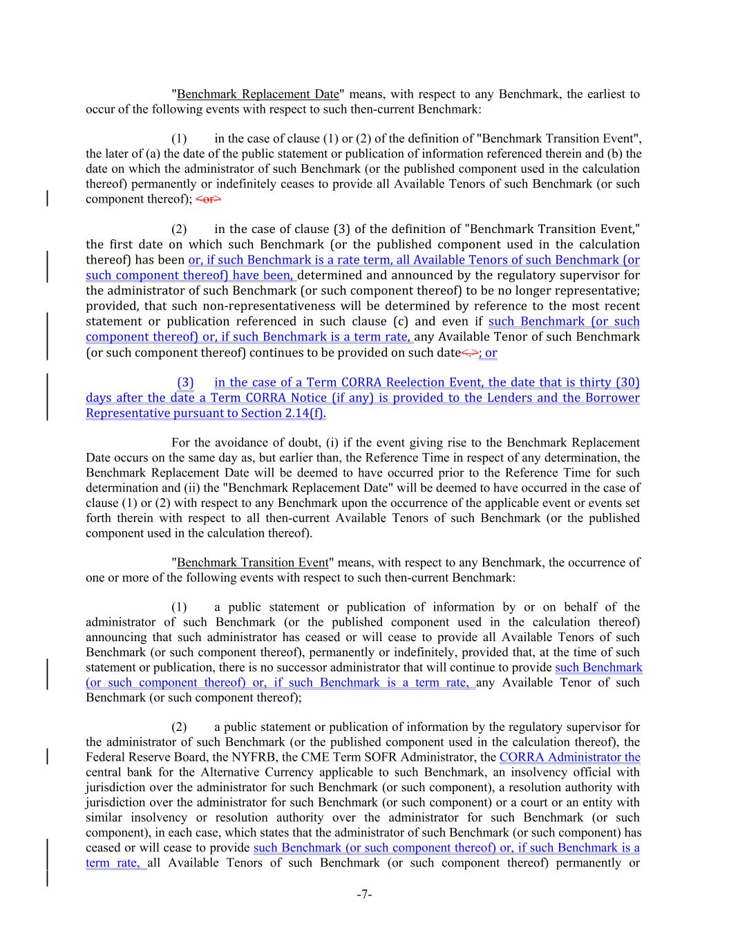 "Benchmark Replacement Date" means, with respect to any Benchmark, the earliest to occur of the following events with respect to such then-current Benchmark: (1) in the case of clause (1) or (2) of the definition of "Benchmark Transition Event", the later of (a) the date of the public statement or publication of information referenced therein and (b) the date on which the administrator of such Benchmark (or the published component used in the calculation thereof) permanently or indefinitely ceases to provide all Available Tenors of such Benchmark (or such component thereof); <or> (2) in the case of clause (3) of the definition of "Benchmark Transition Event," the first date on which such Benchmark (or the published component used in the calculation thereof) has been or, if such Benchmark is a rate term, all Available Tenors of such Benchmark (or such component thereof) have been, determined and announced by the regulatory supervisor for the administrator of such Benchmark (or such component thereof) to be no longer representative; provided, that such non-representativeness will be determined by reference to the most recent statement or publication referenced in such clause (c) and even if such Benchmark (or such component thereof) or, if such Benchmark is a term rate, any Available Tenor of such Benchmark (or such component thereof) continues to be provided on such date<.>; or (3) in the case of a Term CORRA Reelection Event, the date that is thirty (30) days after the date a Term CORRA Notice (if any) is provided to the Lenders and the Borrower Representative pursuant to Section 2.14(f). For the avoidance of doubt, (i) if the event giving rise to the Benchmark Replacement Date occurs on the same day as, but earlier than, the Reference Time in respect of any determination, the Benchmark Replacement Date will be deemed to have occurred prior to the Reference Time for such determination and (ii) the "Benchmark Replacement Date" will be deemed to have occurred in the case of clause (1) or (2) with respect to any Benchmark upon the occurrence of the applicable event or events set forth therein with respect to all then-current Available Tenors of such Benchmark (or the published component used in the calculation thereof). "Benchmark Transition Event" means, with respect to any Benchmark, the occurrence of one or more of the following events with respect to such then-current Benchmark: (1) a public statement or publication of information by or on behalf of the administrator of such Benchmark (or the published component used in the calculation thereof) announcing that such administrator has ceased or will cease to provide all Available Tenors of such Benchmark (or such component thereof), permanently or indefinitely, provided that, at the time of such statement or publication, there is no successor administrator that will continue to provide such Benchmark (or such component thereof) or, if such Benchmark is a term rate, any Available Tenor of such Benchmark (or such component thereof); (2) a public statement or publication of information by the regulatory supervisor for the administrator of such Benchmark (or the published component used in the calculation thereof), the Federal Reserve Board, the NYFRB, the CME Term SOFR Administrator, the CORRA Administrator the central bank for the Alternative Currency applicable to such Benchmark, an insolvency official with jurisdiction over the administrator for such Benchmark (or such component), a resolution authority with jurisdiction over the administrator for such Benchmark (or such component) or a court or an entity with similar insolvency or resolution authority over the administrator for such Benchmark (or such component), in each case, which states that the administrator of such Benchmark (or such component) has ceased or will cease to provide such Benchmark (or such component thereof) or, if such Benchmark is a term rate, all Available Tenors of such Benchmark (or such component thereof) permanently or -7-