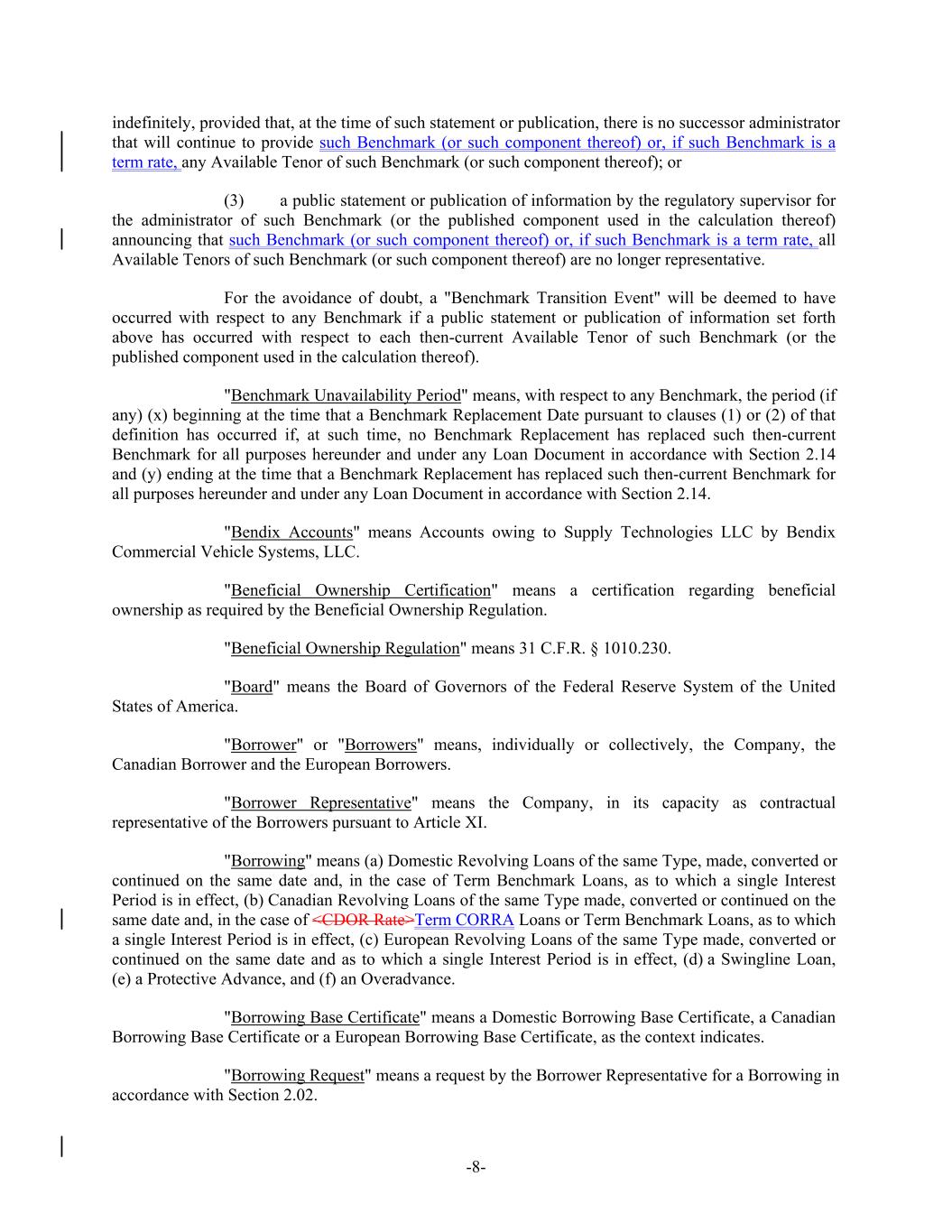 indefinitely, provided that, at the time of such statement or publication, there is no successor administrator that will continue to provide such Benchmark (or such component thereof) or, if such Benchmark is a term rate, any Available Tenor of such Benchmark (or such component thereof); or (3) a public statement or publication of information by the regulatory supervisor for the administrator of such Benchmark (or the published component used in the calculation thereof) announcing that such Benchmark (or such component thereof) or, if such Benchmark is a term rate, all Available Tenors of such Benchmark (or such component thereof) are no longer representative. For the avoidance of doubt, a "Benchmark Transition Event" will be deemed to have occurred with respect to any Benchmark if a public statement or publication of information set forth above has occurred with respect to each then-current Available Tenor of such Benchmark (or the published component used in the calculation thereof). "Benchmark Unavailability Period" means, with respect to any Benchmark, the period (if any) (x) beginning at the time that a Benchmark Replacement Date pursuant to clauses (1) or (2) of that definition has occurred if, at such time, no Benchmark Replacement has replaced such then-current Benchmark for all purposes hereunder and under any Loan Document in accordance with Section 2.14 and (y) ending at the time that a Benchmark Replacement has replaced such then-current Benchmark for all purposes hereunder and under any Loan Document in accordance with Section 2.14. "Bendix Accounts" means Accounts owing to Supply Technologies LLC by Bendix Commercial Vehicle Systems, LLC. "Beneficial Ownership Certification" means a certification regarding beneficial ownership as required by the Beneficial Ownership Regulation. "Beneficial Ownership Regulation" means 31 C.F.R. § 1010.230. "Board" means the Board of Governors of the Federal Reserve System of the United States of America. "Borrower" or "Borrowers" means, individually or collectively, the Company, the Canadian Borrower and the European Borrowers. "Borrower Representative" means the Company, in its capacity as contractual representative of the Borrowers pursuant to Article XI. "Borrowing" means (a) Domestic Revolving Loans of the same Type, made, converted or continued on the same date and, in the case of Term Benchmark Loans, as to which a single Interest Period is in effect, (b) Canadian Revolving Loans of the same Type made, converted or continued on the same date and, in the case of <CDOR Rate>Term CORRA Loans or Term Benchmark Loans, as to which a single Interest Period is in effect, (c) European Revolving Loans of the same Type made, converted or continued on the same date and as to which a single Interest Period is in effect, (d) a Swingline Loan, (e) a Protective Advance, and (f) an Overadvance. "Borrowing Base Certificate" means a Domestic Borrowing Base Certificate, a Canadian Borrowing Base Certificate or a European Borrowing Base Certificate, as the context indicates. "Borrowing Request" means a request by the Borrower Representative for a Borrowing in accordance with Section 2.02. -8-