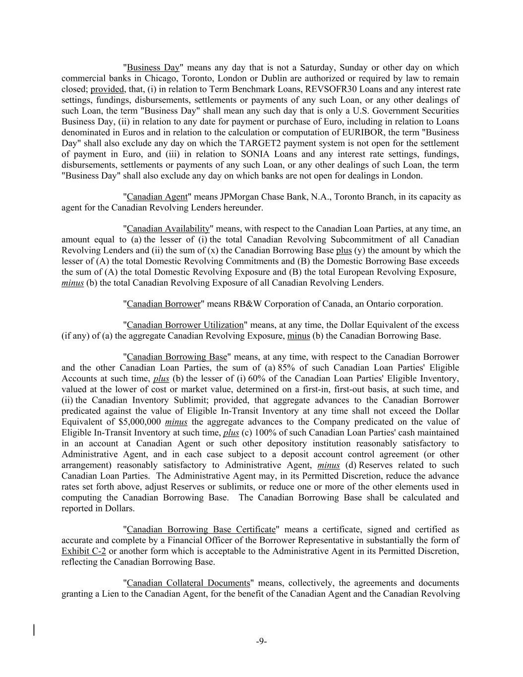 "Business Day" means any day that is not a Saturday, Sunday or other day on which commercial banks in Chicago, Toronto, London or Dublin are authorized or required by law to remain closed; provided, that, (i) in relation to Term Benchmark Loans, REVSOFR30 Loans and any interest rate settings, fundings, disbursements, settlements or payments of any such Loan, or any other dealings of such Loan, the term "Business Day" shall mean any such day that is only a U.S. Government Securities Business Day, (ii) in relation to any date for payment or purchase of Euro, including in relation to Loans denominated in Euros and in relation to the calculation or computation of EURIBOR, the term "Business Day" shall also exclude any day on which the TARGET2 payment system is not open for the settlement of payment in Euro, and (iii) in relation to SONIA Loans and any interest rate settings, fundings, disbursements, settlements or payments of any such Loan, or any other dealings of such Loan, the term "Business Day" shall also exclude any day on which banks are not open for dealings in London. "Canadian Agent" means JPMorgan Chase Bank, N.A., Toronto Branch, in its capacity as agent for the Canadian Revolving Lenders hereunder. "Canadian Availability" means, with respect to the Canadian Loan Parties, at any time, an amount equal to (a) the lesser of (i) the total Canadian Revolving Subcommitment of all Canadian Revolving Lenders and (ii) the sum of (x) the Canadian Borrowing Base plus (y) the amount by which the lesser of (A) the total Domestic Revolving Commitments and (B) the Domestic Borrowing Base exceeds the sum of (A) the total Domestic Revolving Exposure and (B) the total European Revolving Exposure, minus (b) the total Canadian Revolving Exposure of all Canadian Revolving Lenders. "Canadian Borrower" means RB&W Corporation of Canada, an Ontario corporation. "Canadian Borrower Utilization" means, at any time, the Dollar Equivalent of the excess (if any) of (a) the aggregate Canadian Revolving Exposure, minus (b) the Canadian Borrowing Base. "Canadian Borrowing Base" means, at any time, with respect to the Canadian Borrower and the other Canadian Loan Parties, the sum of (a) 85% of such Canadian Loan Parties' Eligible Accounts at such time, plus (b) the lesser of (i) 60% of the Canadian Loan Parties' Eligible Inventory, valued at the lower of cost or market value, determined on a first-in, first-out basis, at such time, and (ii) the Canadian Inventory Sublimit; provided, that aggregate advances to the Canadian Borrower predicated against the value of Eligible In-Transit Inventory at any time shall not exceed the Dollar Equivalent of $5,000,000 minus the aggregate advances to the Company predicated on the value of Eligible In-Transit Inventory at such time, plus (c) 100% of such Canadian Loan Parties' cash maintained in an account at Canadian Agent or such other depository institution reasonably satisfactory to Administrative Agent, and in each case subject to a deposit account control agreement (or other arrangement) reasonably satisfactory to Administrative Agent, minus (d) Reserves related to such Canadian Loan Parties. The Administrative Agent may, in its Permitted Discretion, reduce the advance rates set forth above, adjust Reserves or sublimits, or reduce one or more of the other elements used in computing the Canadian Borrowing Base. The Canadian Borrowing Base shall be calculated and reported in Dollars. "Canadian Borrowing Base Certificate" means a certificate, signed and certified as accurate and complete by a Financial Officer of the Borrower Representative in substantially the form of Exhibit C-2 or another form which is acceptable to the Administrative Agent in its Permitted Discretion, reflecting the Canadian Borrowing Base. "Canadian Collateral Documents" means, collectively, the agreements and documents granting a Lien to the Canadian Agent, for the benefit of the Canadian Agent and the Canadian Revolving -9-