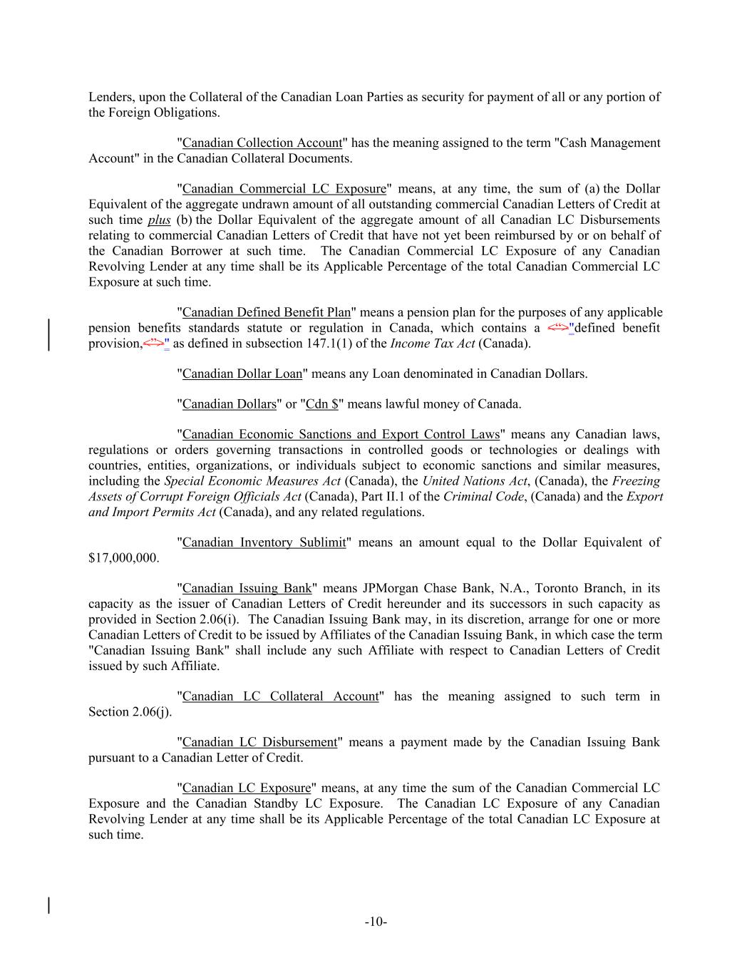 Lenders, upon the Collateral of the Canadian Loan Parties as security for payment of all or any portion of the Foreign Obligations. "Canadian Collection Account" has the meaning assigned to the term "Cash Management Account" in the Canadian Collateral Documents. "Canadian Commercial LC Exposure" means, at any time, the sum of (a) the Dollar Equivalent of the aggregate undrawn amount of all outstanding commercial Canadian Letters of Credit at such time plus (b) the Dollar Equivalent of the aggregate amount of all Canadian LC Disbursements relating to commercial Canadian Letters of Credit that have not yet been reimbursed by or on behalf of the Canadian Borrower at such time. The Canadian Commercial LC Exposure of any Canadian Revolving Lender at any time shall be its Applicable Percentage of the total Canadian Commercial LC Exposure at such time. "Canadian Defined Benefit Plan" means a pension plan for the purposes of any applicable pension benefits standards statute or regulation in Canada, which contains a <“>"defined benefit provision,<”>" as defined in subsection 147.1(1) of the Income Tax Act (Canada). "Canadian Dollar Loan" means any Loan denominated in Canadian Dollars. "Canadian Dollars" or "Cdn $" means lawful money of Canada. "Canadian Economic Sanctions and Export Control Laws" means any Canadian laws, regulations or orders governing transactions in controlled goods or technologies or dealings with countries, entities, organizations, or individuals subject to economic sanctions and similar measures, including the Special Economic Measures Act (Canada), the United Nations Act, (Canada), the Freezing Assets of Corrupt Foreign Officials Act (Canada), Part II.1 of the Criminal Code, (Canada) and the Export and Import Permits Act (Canada), and any related regulations. "Canadian Inventory Sublimit" means an amount equal to the Dollar Equivalent of $17,000,000. "Canadian Issuing Bank" means JPMorgan Chase Bank, N.A., Toronto Branch, in its capacity as the issuer of Canadian Letters of Credit hereunder and its successors in such capacity as provided in Section 2.06(i). The Canadian Issuing Bank may, in its discretion, arrange for one or more Canadian Letters of Credit to be issued by Affiliates of the Canadian Issuing Bank, in which case the term "Canadian Issuing Bank" shall include any such Affiliate with respect to Canadian Letters of Credit issued by such Affiliate. "Canadian LC Collateral Account" has the meaning assigned to such term in Section 2.06(j). "Canadian LC Disbursement" means a payment made by the Canadian Issuing Bank pursuant to a Canadian Letter of Credit. "Canadian LC Exposure" means, at any time the sum of the Canadian Commercial LC Exposure and the Canadian Standby LC Exposure. The Canadian LC Exposure of any Canadian Revolving Lender at any time shall be its Applicable Percentage of the total Canadian LC Exposure at such time. -10-