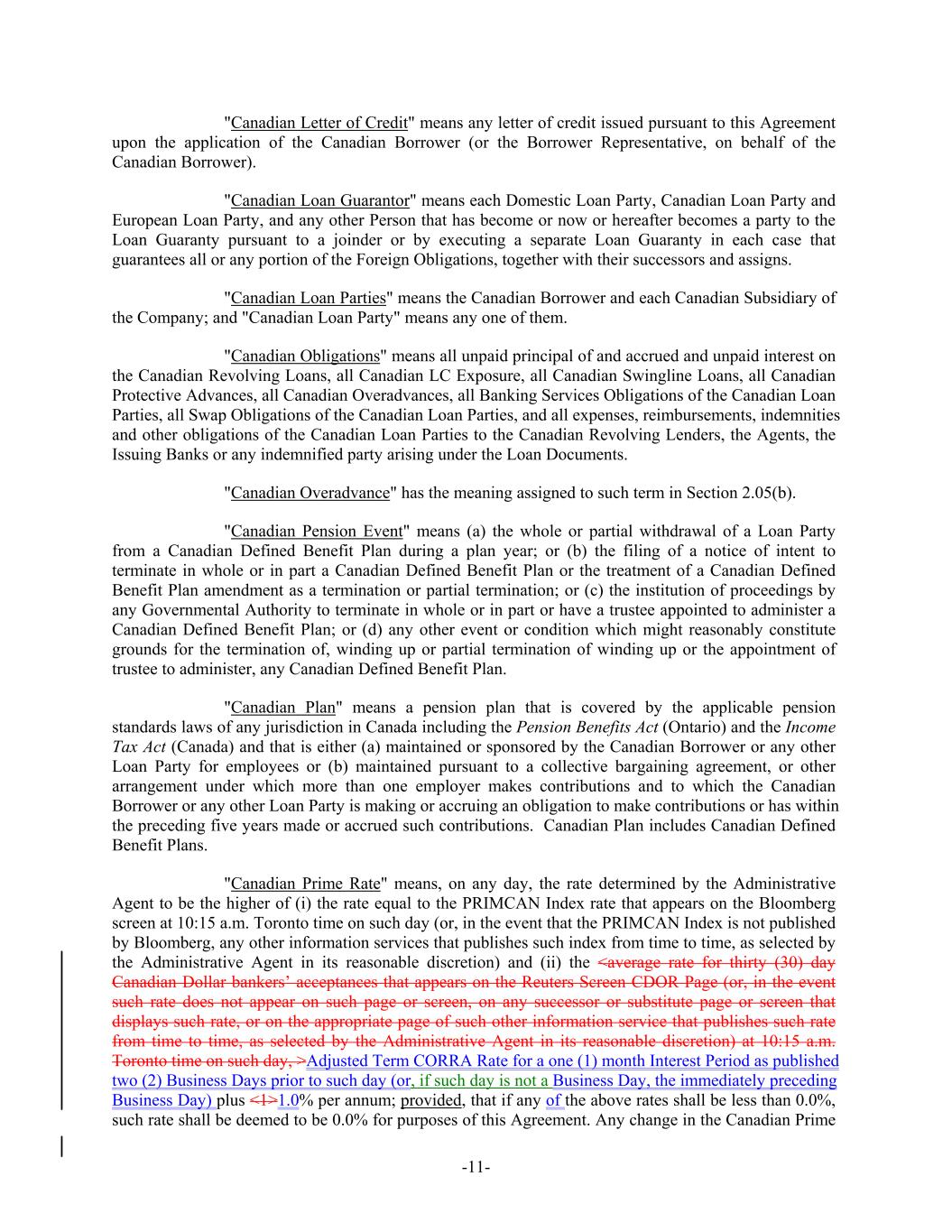 "Canadian Letter of Credit" means any letter of credit issued pursuant to this Agreement upon the application of the Canadian Borrower (or the Borrower Representative, on behalf of the Canadian Borrower). "Canadian Loan Guarantor" means each Domestic Loan Party, Canadian Loan Party and European Loan Party, and any other Person that has become or now or hereafter becomes a party to the Loan Guaranty pursuant to a joinder or by executing a separate Loan Guaranty in each case that guarantees all or any portion of the Foreign Obligations, together with their successors and assigns. "Canadian Loan Parties" means the Canadian Borrower and each Canadian Subsidiary of the Company; and "Canadian Loan Party" means any one of them. "Canadian Obligations" means all unpaid principal of and accrued and unpaid interest on the Canadian Revolving Loans, all Canadian LC Exposure, all Canadian Swingline Loans, all Canadian Protective Advances, all Canadian Overadvances, all Banking Services Obligations of the Canadian Loan Parties, all Swap Obligations of the Canadian Loan Parties, and all expenses, reimbursements, indemnities and other obligations of the Canadian Loan Parties to the Canadian Revolving Lenders, the Agents, the Issuing Banks or any indemnified party arising under the Loan Documents. "Canadian Overadvance" has the meaning assigned to such term in Section 2.05(b). "Canadian Pension Event" means (a) the whole or partial withdrawal of a Loan Party from a Canadian Defined Benefit Plan during a plan year; or (b) the filing of a notice of intent to terminate in whole or in part a Canadian Defined Benefit Plan or the treatment of a Canadian Defined Benefit Plan amendment as a termination or partial termination; or (c) the institution of proceedings by any Governmental Authority to terminate in whole or in part or have a trustee appointed to administer a Canadian Defined Benefit Plan; or (d) any other event or condition which might reasonably constitute grounds for the termination of, winding up or partial termination of winding up or the appointment of trustee to administer, any Canadian Defined Benefit Plan. "Canadian Plan" means a pension plan that is covered by the applicable pension standards laws of any jurisdiction in Canada including the Pension Benefits Act (Ontario) and the Income Tax Act (Canada) and that is either (a) maintained or sponsored by the Canadian Borrower or any other Loan Party for employees or (b) maintained pursuant to a collective bargaining agreement, or other arrangement under which more than one employer makes contributions and to which the Canadian Borrower or any other Loan Party is making or accruing an obligation to make contributions or has within the preceding five years made or accrued such contributions. Canadian Plan includes Canadian Defined Benefit Plans. "Canadian Prime Rate" means, on any day, the rate determined by the Administrative Agent to be the higher of (i) the rate equal to the PRIMCAN Index rate that appears on the Bloomberg screen at 10:15 a.m. Toronto time on such day (or, in the event that the PRIMCAN Index is not published by Bloomberg, any other information services that publishes such index from time to time, as selected by the Administrative Agent in its reasonable discretion) and (ii) the <average rate for thirty (30) day Canadian Dollar bankers’ acceptances that appears on the Reuters Screen CDOR Page (or, in the event such rate does not appear on such page or screen, on any successor or substitute page or screen that displays such rate, or on the appropriate page of such other information service that publishes such rate from time to time, as selected by the Administrative Agent in its reasonable discretion) at 10:15 a.m. Toronto time on such day, >Adjusted Term CORRA Rate for a one (1) month Interest Period as published two (2) Business Days prior to such day (or, if such day is not a Business Day, the immediately preceding Business Day) plus <1>1.0% per annum; provided, that if any of the above rates shall be less than 0.0%, such rate shall be deemed to be 0.0% for purposes of this Agreement. Any change in the Canadian Prime -11-