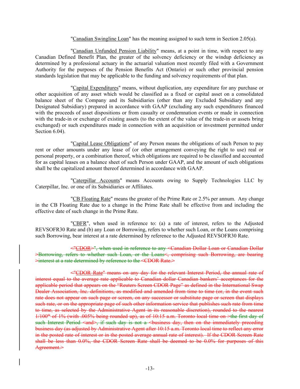 "Canadian Swingline Loan" has the meaning assigned to such term in Section 2.05(a). "Canadian Unfunded Pension Liability" means, at a point in time, with respect to any Canadian Defined Benefit Plan, the greater of the solvency deficiency or the windup deficiency as determined by a professional actuary in the actuarial valuation most recently filed with a Government Authority for the purposes of the Pension Benefits Act (Ontario) or such other provincial pension standards legislation that may be applicable to the funding and solvency requirements of that plan. "Capital Expenditures" means, without duplication, any expenditure for any purchase or other acquisition of any asset which would be classified as a fixed or capital asset on a consolidated balance sheet of the Company and its Subsidiaries (other than any Excluded Subsidiary and any Designated Subsidiary) prepared in accordance with GAAP (excluding any such expenditures financed with the proceeds of asset dispositions or from casualty or condemnation events or made in connection with the trade-in or exchange of existing assets (to the extent of the value of the trade-in or assets bring exchanged) or such expenditures made in connection with an acquisition or investment permitted under Section 6.04). "Capital Lease Obligations" of any Person means the obligations of such Person to pay rent or other amounts under any lease of (or other arrangement conveying the right to use) real or personal property, or a combination thereof, which obligations are required to be classified and accounted for as capital leases on a balance sheet of such Person under GAAP, and the amount of such obligations shall be the capitalized amount thereof determined in accordance with GAAP. "Caterpillar Accounts" means Accounts owing to Supply Technologies LLC by Caterpillar, Inc. or one of its Subsidiaries or Affiliates. "CB Floating Rate" means the greater of the Prime Rate or 2.5% per annum. Any change in the CB Floating Rate due to a change in the Prime Rate shall be effective from and including the effective date of such change in the Prime Rate. "CBFR", when used in reference to: (a) a rate of interest, refers to the Adjusted REVSOFR30 Rate and (b) any Loan or Borrowing, refers to whether such Loan, or the Loans comprising such Borrowing, bear interest at a rate determined by reference to the Adjusted REVSOFR30 Rate. <"CDOR>", when used in reference to any <Canadian Dollar Loan or Canadian Dollar >Borrowing, refers to whether such Loan, or the Loans<, comprising such Borrowing, are bearing >interest at a rate determined by reference to the <CDOR Rate.> <"CDOR Rate" means on any day for the relevant Interest Period, the annual rate of interest equal to the average rate applicable to Canadian dollar Canadian bankers’ acceptances for the applicable period that appears on the “Reuters Screen CDOR Page” as defined in the International Swap Dealer Association, Inc. definitions, as modified and amended from time to time (or, in the event such rate does not appear on such page or screen, on any successor or substitute page or screen that displays such rate, or on the appropriate page of such other information service that publishes such rate from time to time, as selected by the Administrative Agent in its reasonable discretion), rounded to the nearest 1/100th of 1% (with .005% being rounded up), as of 10:15 a.m. Toronto local time on >the first day of such Interest Period <and>, if such day is not a <business day, then on the immediately preceding business day (as adjusted by Administrative Agent after 10:15 a.m. Toronto local time to reflect any error in the posted rate of interest or in the posted average annual rate of interest). If the CDOR Screen Rate shall be less than 0.0%, the CDOR Screen Rate shall be deemed to be 0.0% for purposes of this Agreement.> -13-