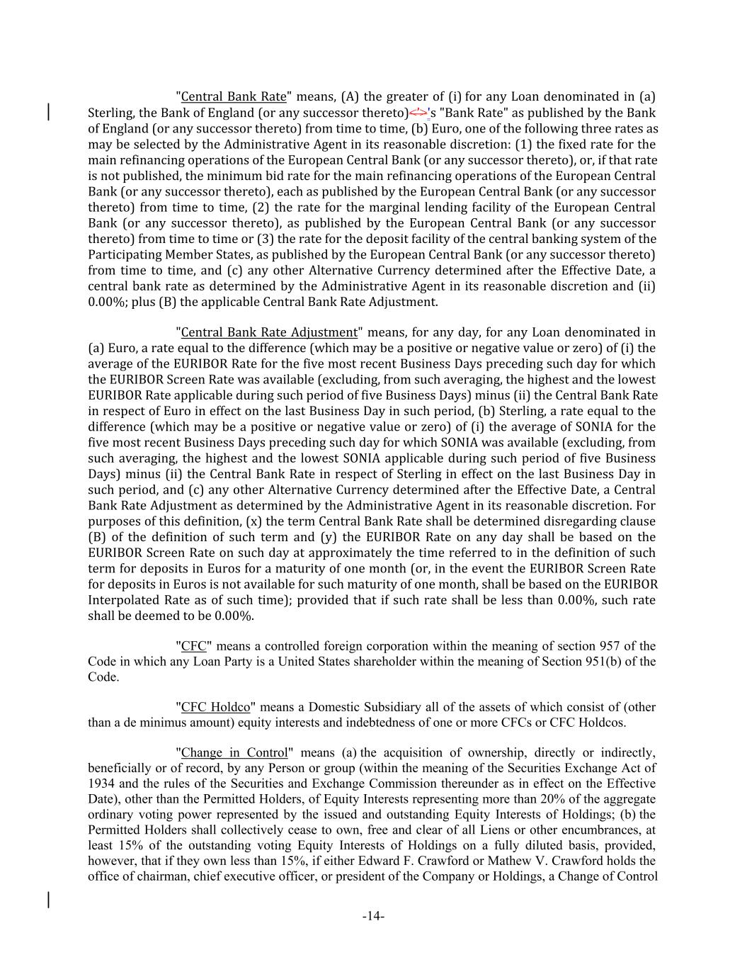 "Central Bank Rate" means, (A) the greater of (i) for any Loan denominated in (a) Sterling, the Bank of England (or any successor thereto)<’>'s "Bank Rate" as published by the Bank of England (or any successor thereto) from time to time, (b) Euro, one of the following three rates as may be selected by the Administrative Agent in its reasonable discretion: (1) the fixed rate for the main refinancing operations of the European Central Bank (or any successor thereto), or, if that rate is not published, the minimum bid rate for the main refinancing operations of the European Central Bank (or any successor thereto), each as published by the European Central Bank (or any successor thereto) from time to time, (2) the rate for the marginal lending facility of the European Central Bank (or any successor thereto), as published by the European Central Bank (or any successor thereto) from time to time or (3) the rate for the deposit facility of the central banking system of the Participating Member States, as published by the European Central Bank (or any successor thereto) from time to time, and (c) any other Alternative Currency determined after the Effective Date, a central bank rate as determined by the Administrative Agent in its reasonable discretion and (ii) 0.00%; plus (B) the applicable Central Bank Rate Adjustment. "Central Bank Rate Adjustment" means, for any day, for any Loan denominated in (a) Euro, a rate equal to the difference (which may be a positive or negative value or zero) of (i) the average of the EURIBOR Rate for the five most recent Business Days preceding such day for which the EURIBOR Screen Rate was available (excluding, from such averaging, the highest and the lowest EURIBOR Rate applicable during such period of five Business Days) minus (ii) the Central Bank Rate in respect of Euro in effect on the last Business Day in such period, (b) Sterling, a rate equal to the difference (which may be a positive or negative value or zero) of (i) the average of SONIA for the five most recent Business Days preceding such day for which SONIA was available (excluding, from such averaging, the highest and the lowest SONIA applicable during such period of five Business Days) minus (ii) the Central Bank Rate in respect of Sterling in effect on the last Business Day in such period, and (c) any other Alternative Currency determined after the Effective Date, a Central Bank Rate Adjustment as determined by the Administrative Agent in its reasonable discretion. For purposes of this definition, (x) the term Central Bank Rate shall be determined disregarding clause (B) of the definition of such term and (y) the EURIBOR Rate on any day shall be based on the EURIBOR Screen Rate on such day at approximately the time referred to in the definition of such term for deposits in Euros for a maturity of one month (or, in the event the EURIBOR Screen Rate for deposits in Euros is not available for such maturity of one month, shall be based on the EURIBOR Interpolated Rate as of such time); provided that if such rate shall be less than 0.00%, such rate shall be deemed to be 0.00%. "CFC" means a controlled foreign corporation within the meaning of section 957 of the Code in which any Loan Party is a United States shareholder within the meaning of Section 951(b) of the Code. "CFC Holdco" means a Domestic Subsidiary all of the assets of which consist of (other than a de minimus amount) equity interests and indebtedness of one or more CFCs or CFC Holdcos. "Change in Control" means (a) the acquisition of ownership, directly or indirectly, beneficially or of record, by any Person or group (within the meaning of the Securities Exchange Act of 1934 and the rules of the Securities and Exchange Commission thereunder as in effect on the Effective Date), other than the Permitted Holders, of Equity Interests representing more than 20% of the aggregate ordinary voting power represented by the issued and outstanding Equity Interests of Holdings; (b) the Permitted Holders shall collectively cease to own, free and clear of all Liens or other encumbrances, at least 15% of the outstanding voting Equity Interests of Holdings on a fully diluted basis, provided, however, that if they own less than 15%, if either Edward F. Crawford or Mathew V. Crawford holds the office of chairman, chief executive officer, or president of the Company or Holdings, a Change of Control -14-